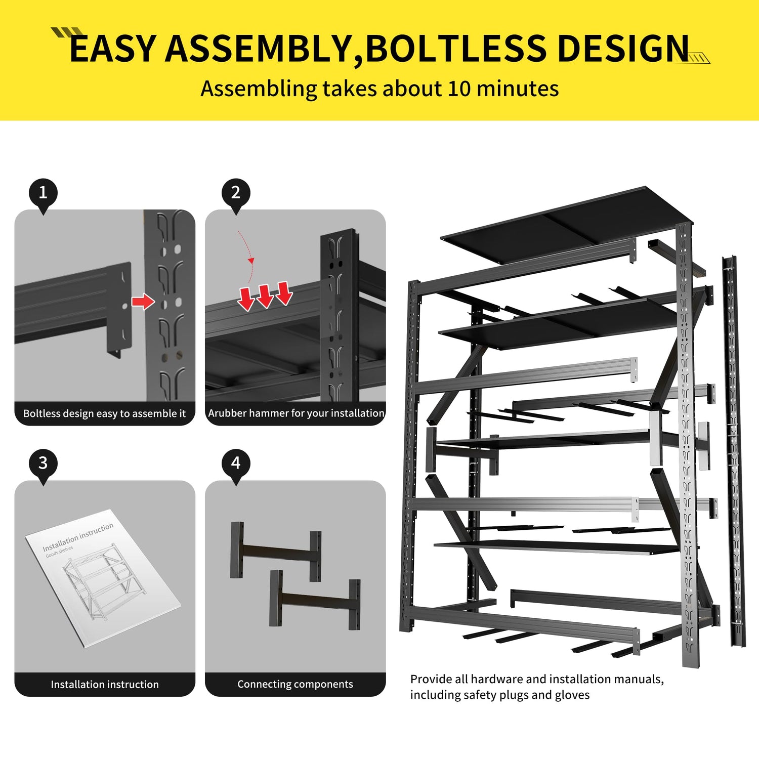 - [Quick Installation, Floor-Friendly] The metal shelves for storage heavy duty includes a comprehensive installation guide, an instructional video, and all necessary accessories. To help you assemble our garage storage rack quickly, we also provide you with a hammer and a pair of gloves that can be assembled in a few simple steps, ready-to-use.This heavy duty garage shelving is equipped with rubber foot pads on the bottom to prevent scratches on the floor.Choosing our InaryLof shelving is the best gift for your family