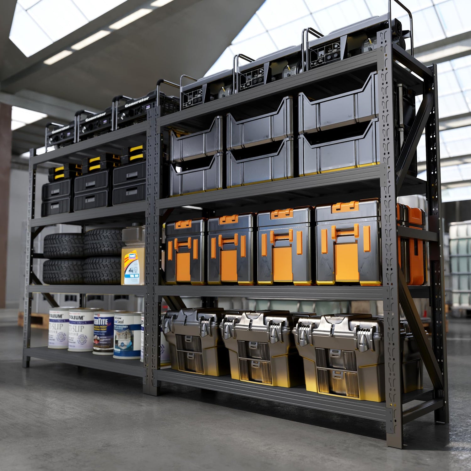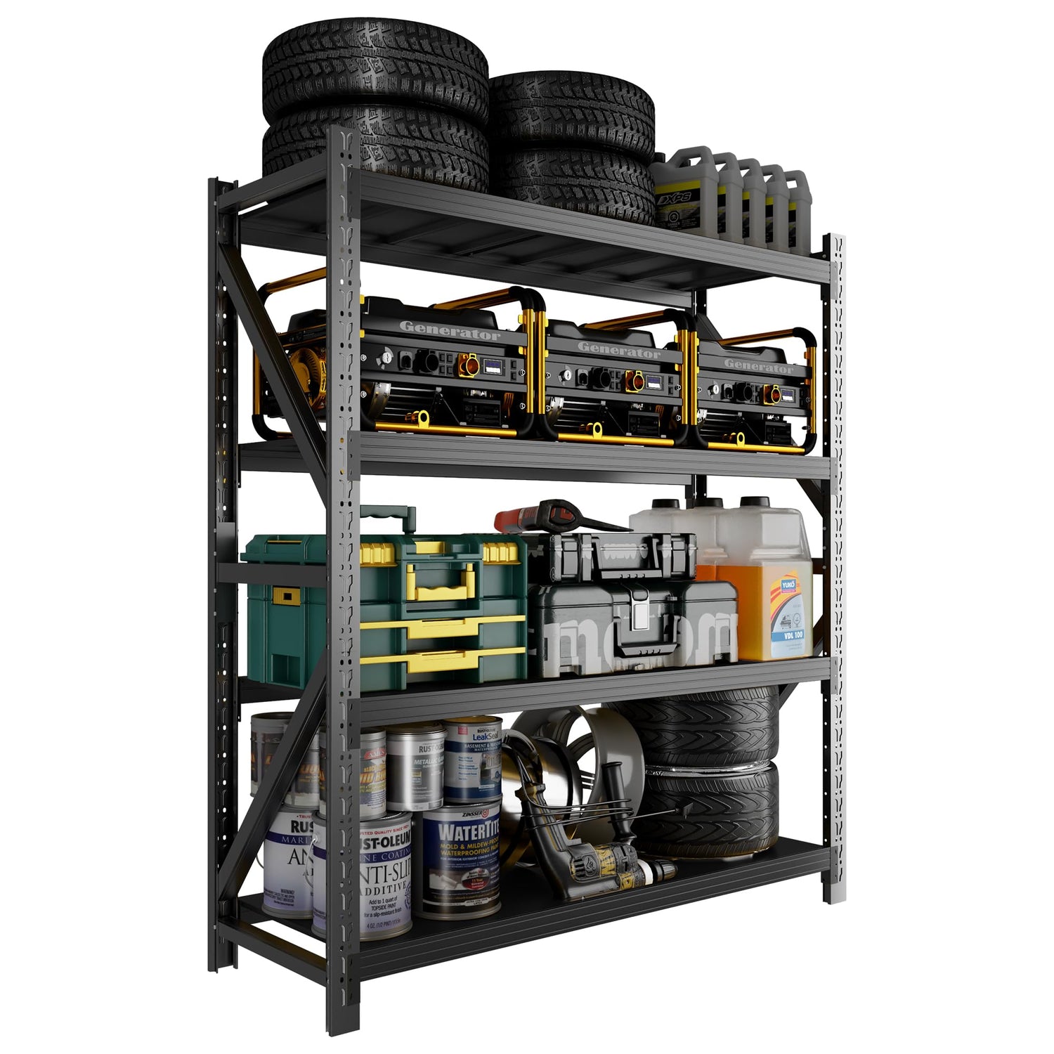 - [Optimized Space, Powerful Storage Capacity] The dimensions of this 4-tier storage shelving are 23.6"D*59.1"W*78.7"H. The design of garage shelving is both simple and sturdy, ensuring the safe and secure storage of a substantial number of items. The garage shelving heavy duty is evident in its ability to manage daily clutter while also accommodating heavy tools, equipment, or home decor with ease. This versatile storage shelving not only organizes your home garage but also caters to the storage needs for corporate warehouses, basements, as well as kitchen utensils and living room decorations