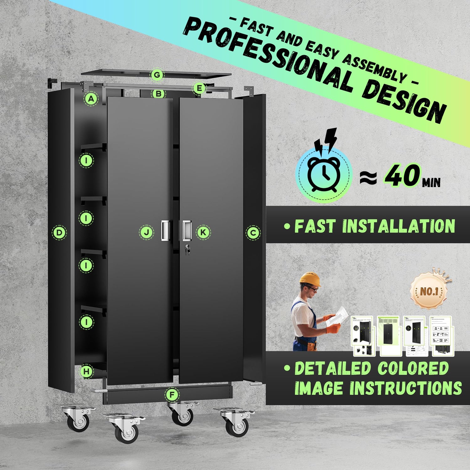 INTERGREAT Metal Storage Cabinet with Wheels, 75" Garage Storage Cabinets with Door and 4 Shelves, Tool Storage Locker on Caster for Home, Office, Black