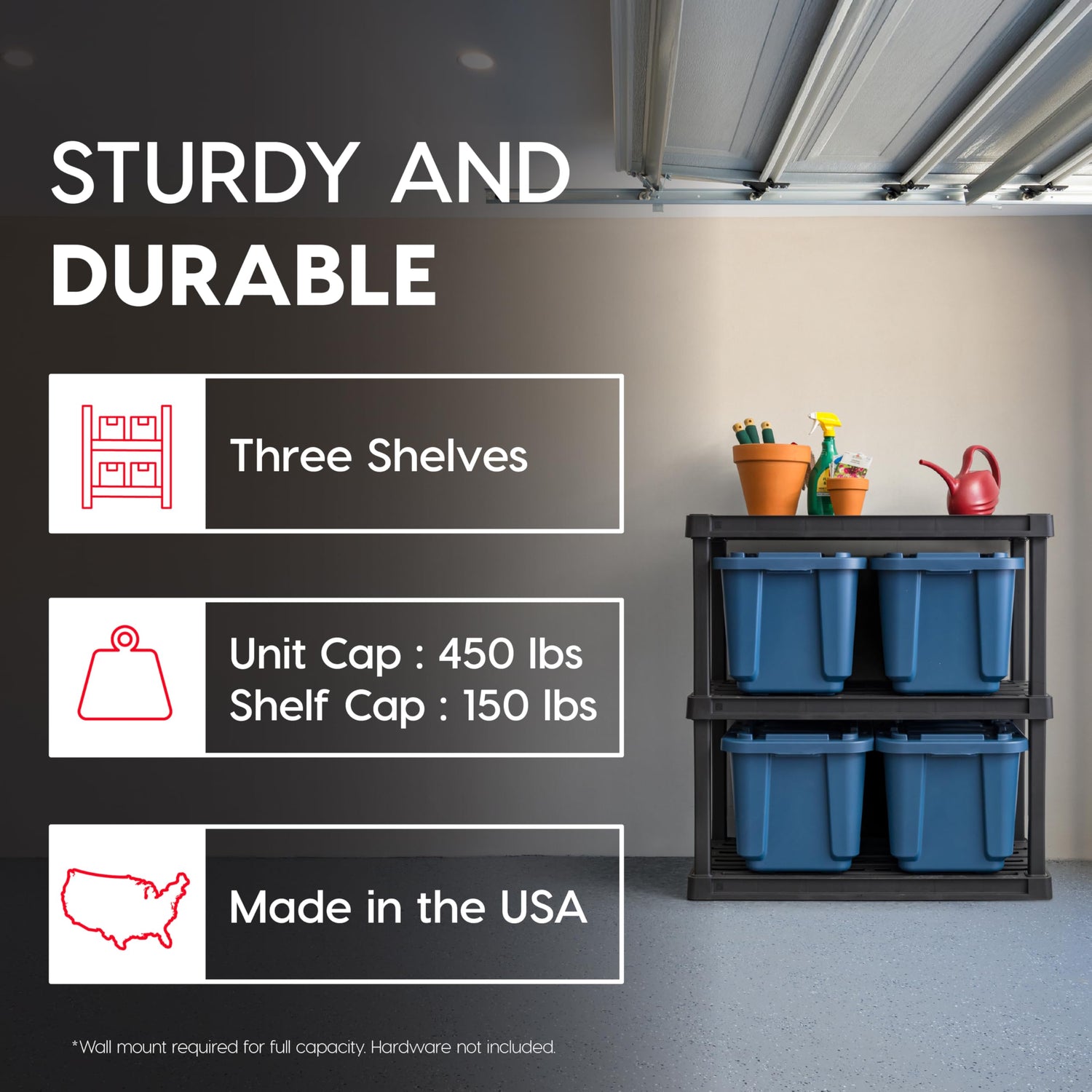 Details: Tackle tougher messes and get organized with the IRIS USA 3-tier recycled plastic storage shelf! The fixed height shelving unit gives you a space-saving and convenient way to keep your stuff organized and within reach while the smooth matte black color easily blends in with the décor of any room in the house or garage. Use the shelving unit in the garage, pantry, basement, closet, entryway, shed, patio, utility or laundry rooms, or anywhere else where a simple yet sturdy shelf is needed. Each shelf on the solidly built and well-ventilated unit holds up to 150lbs per shelf, or 450lbs in total if the weight is evenly distributed between the shelves (wall mount recommended, not included), and no tools are needed for this easy to assemble unit. Just avoid storing it in direct sunlight. Let's make life a little more organized and a little easier.
