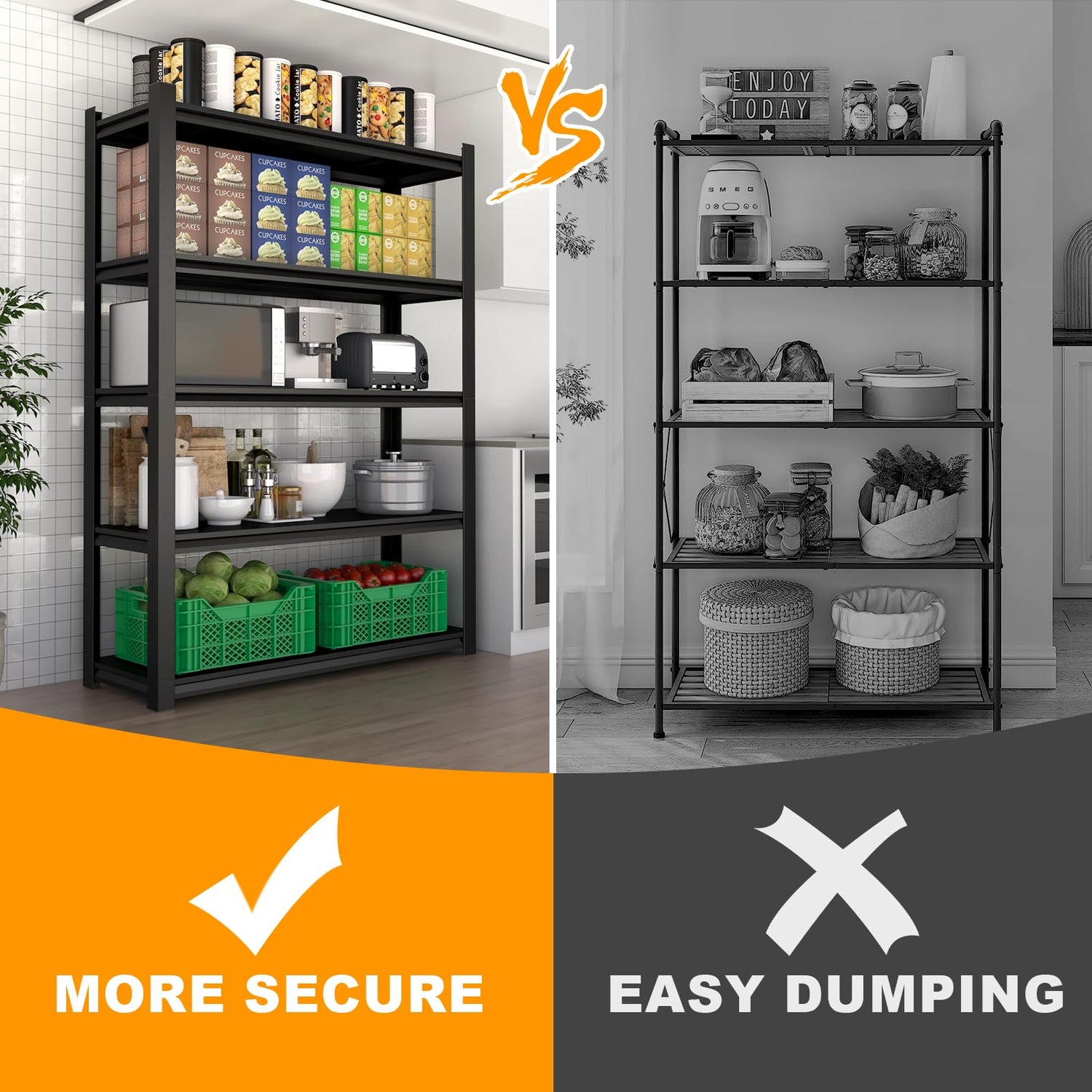 - 【Multipurpose Uses】Metal shelves for storage heavy duty can be used in garages, basements, storage rooms, kitchens, living rooms and more. Garage heavy duty shelving has extra storage space for tires, generators, toolboxes and other types of items, suitable for both heavy and light items.5-tier shelving not only has a wide range of usage scenarios, but also keeps the space organized, which is your best choice.