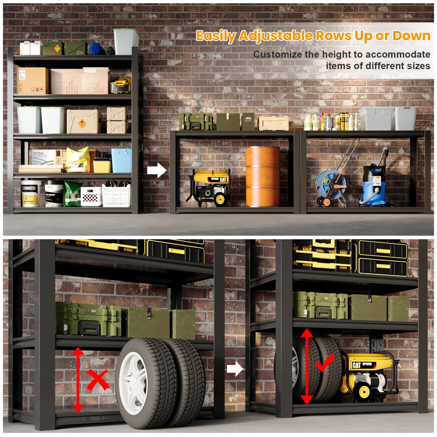 - 【Adjustable Shelves】Heavy duty storage shelves for garage is designed with adjustable connectors. The height of each layer is not only adjustable by moving the crossbar meet the different heights of needed, but also the shelf can be assembled or disassembled into several different metal shelving. Two horizontal racks can be used as workbench can be used for garage storage shelf.