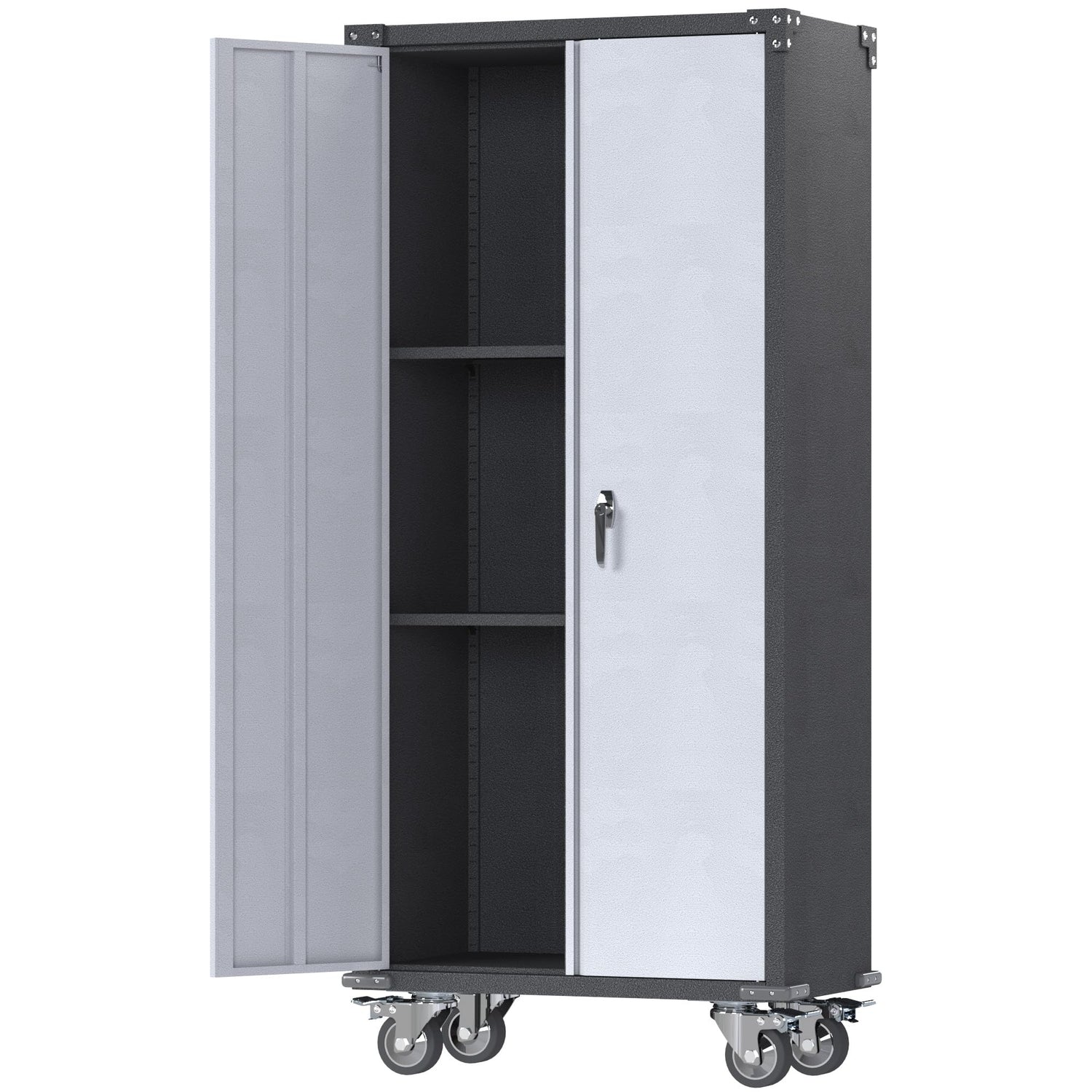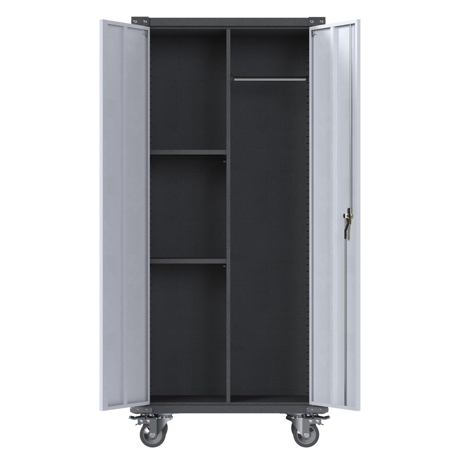 Details: JAORD Metal Garage Storage Cabinet with Hanging Rod, Broom Closet Storage Cabinet, 71" Tall Rolling Tool Storage Cabinet with Locking Doors and Shelves