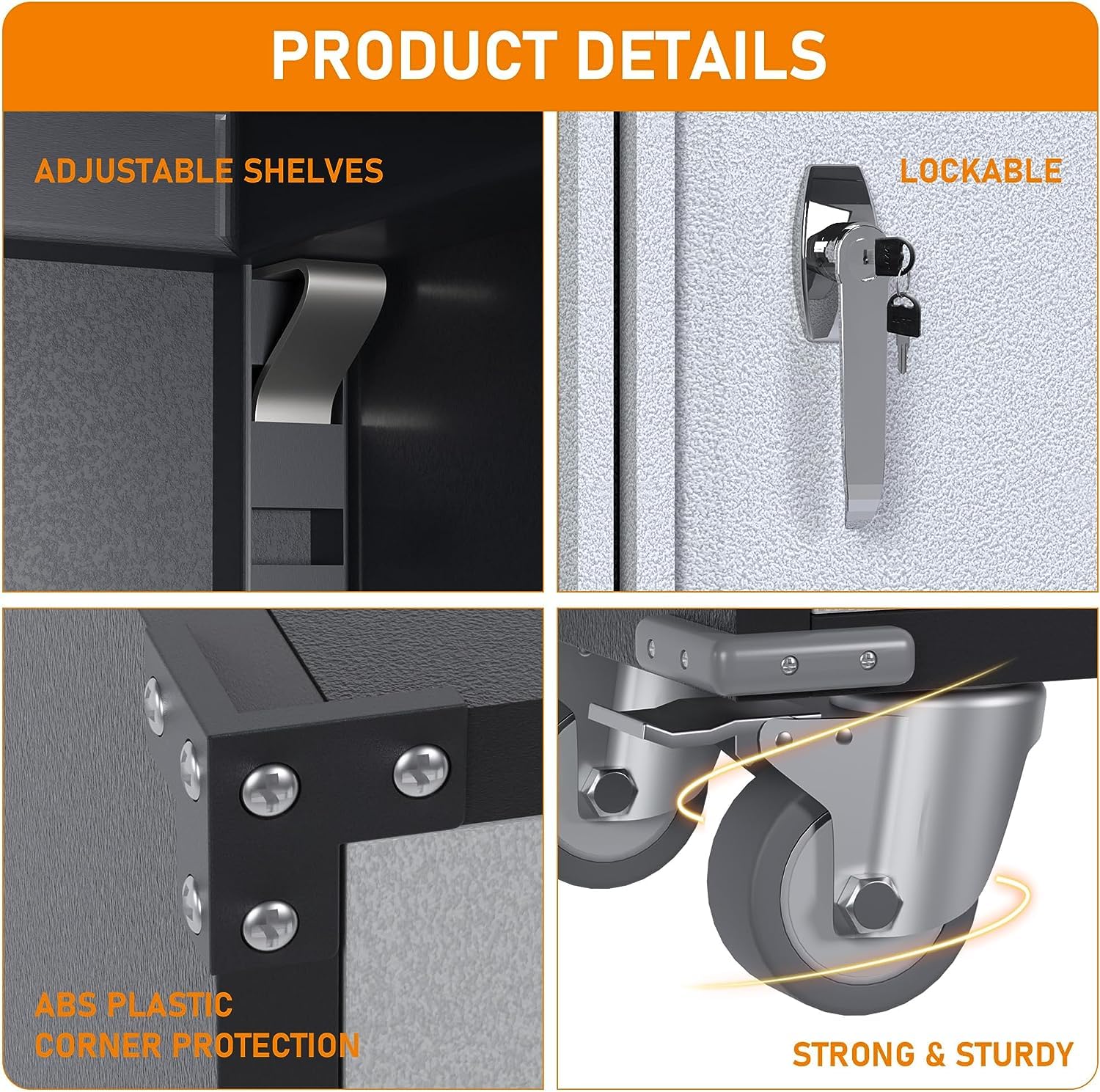 - 【360° Rolling Wheels】Rolling storage cabinet with 4 detachable casters you can easily move in any direction, each wheel with a fixed lock, when you move the cabinet to the right position to be able to fix it on the floor. The wheels are made of rubber, which can effectively reduce noise and protect the floor. The four bottom corners are equipped with protective devices to prevent collision injuries.