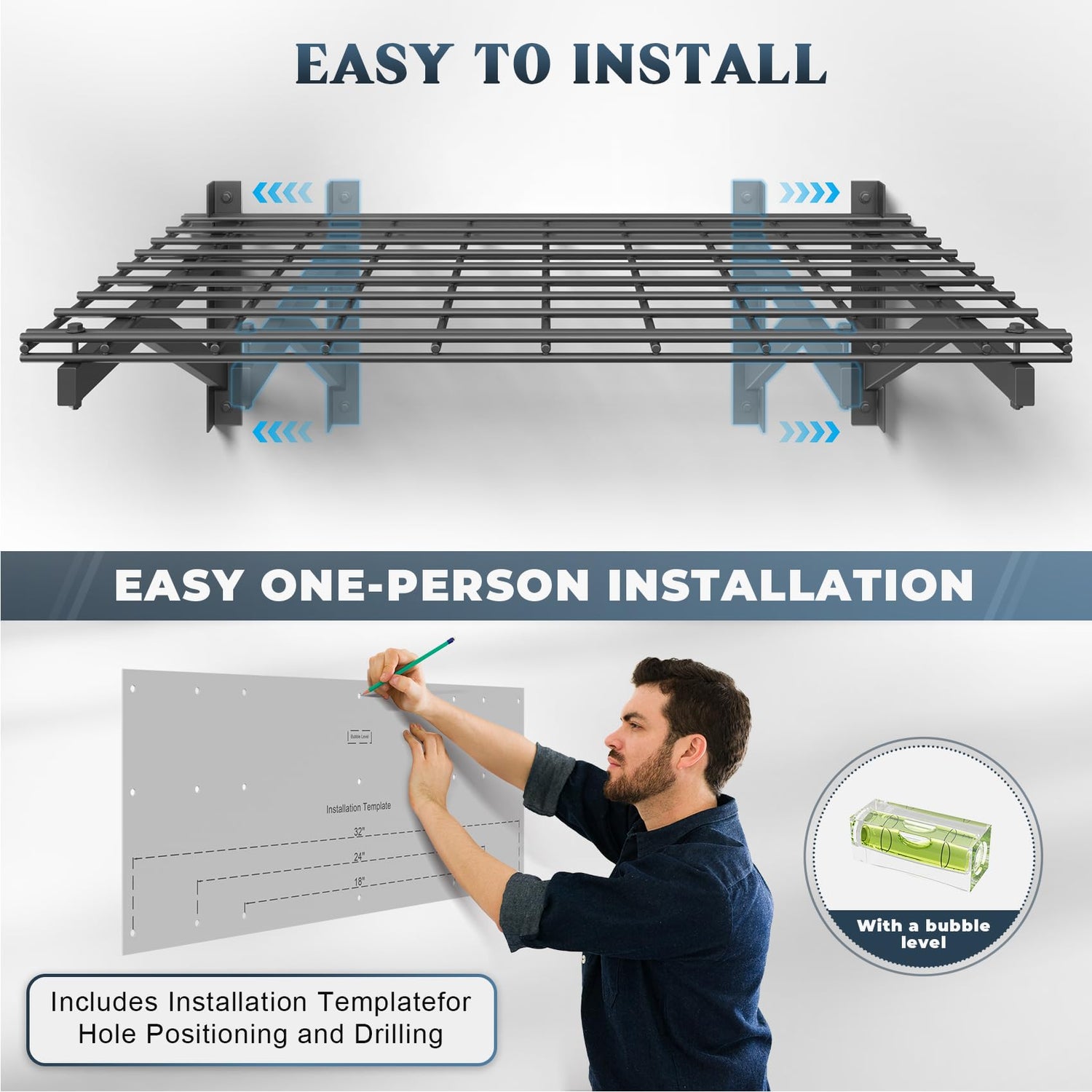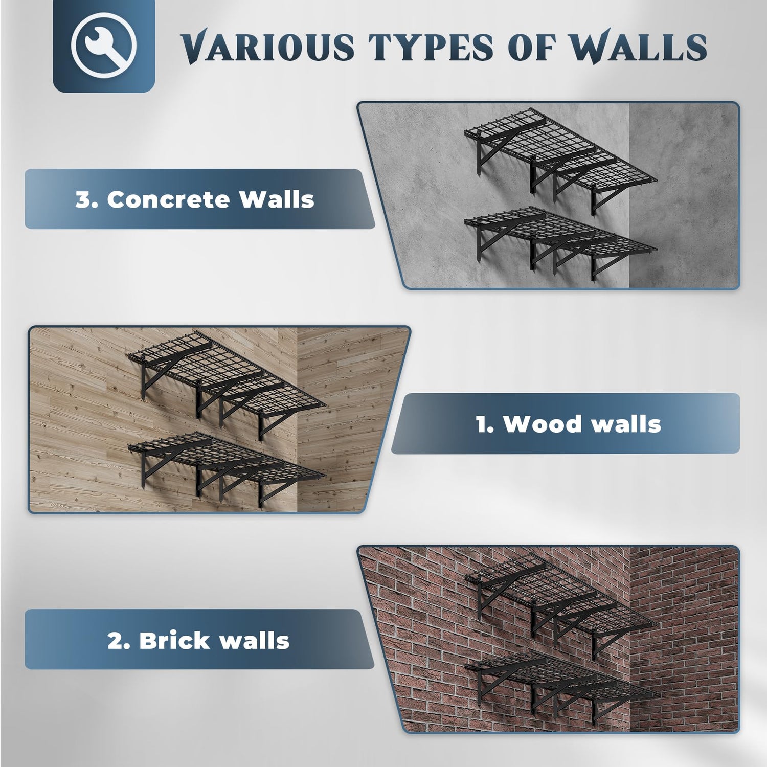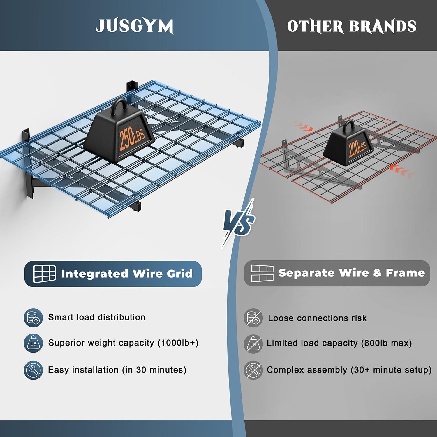 - đăHeavy-Duty Load Capacityă- Jusgym garage shelving wall mounted system is engineered with premium steel, offering exceptional strength. Each 2x3ft bracket holds up to 250 lbs, and with 4 shelves totaling 1000lbs capacity, it effortlessly stores bulky items like tools, tires, and heavy storage bins. Built to last, even under extreme weight!