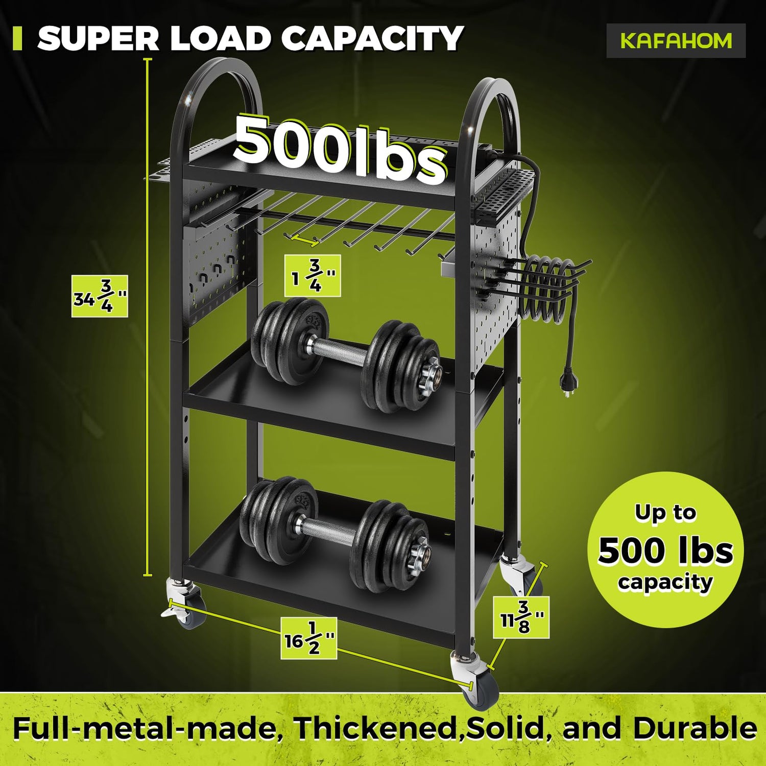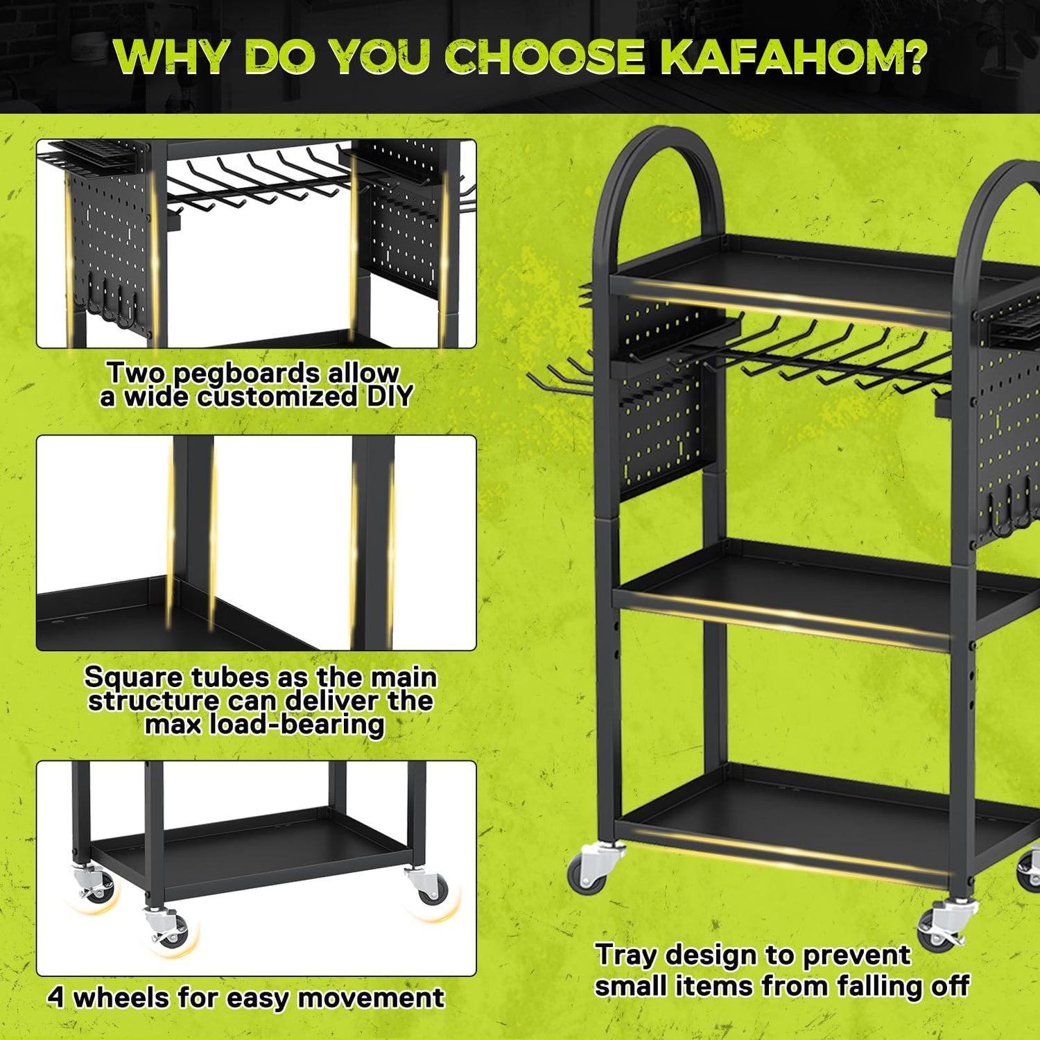 - All-Metal Construction: Built to last, the KAFAHOM 4-Tier rolling tool cart is crafted entirely from high-quality metal. This robust construction ensures superior durability and a higher weight capacity, supporting over 500 pounds. The heavy-duty design guarantees long-term performance, making it a reliable addition to any workshop or garage.