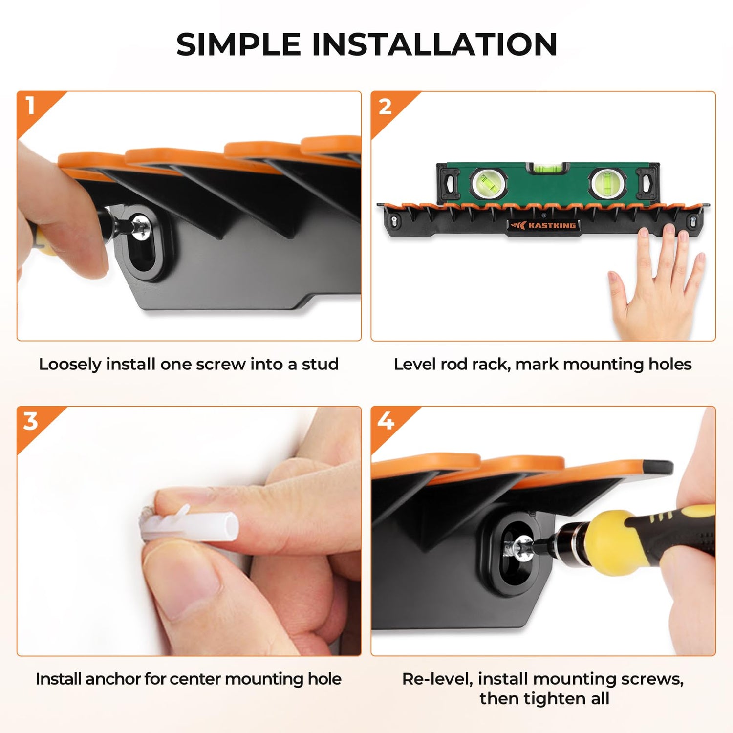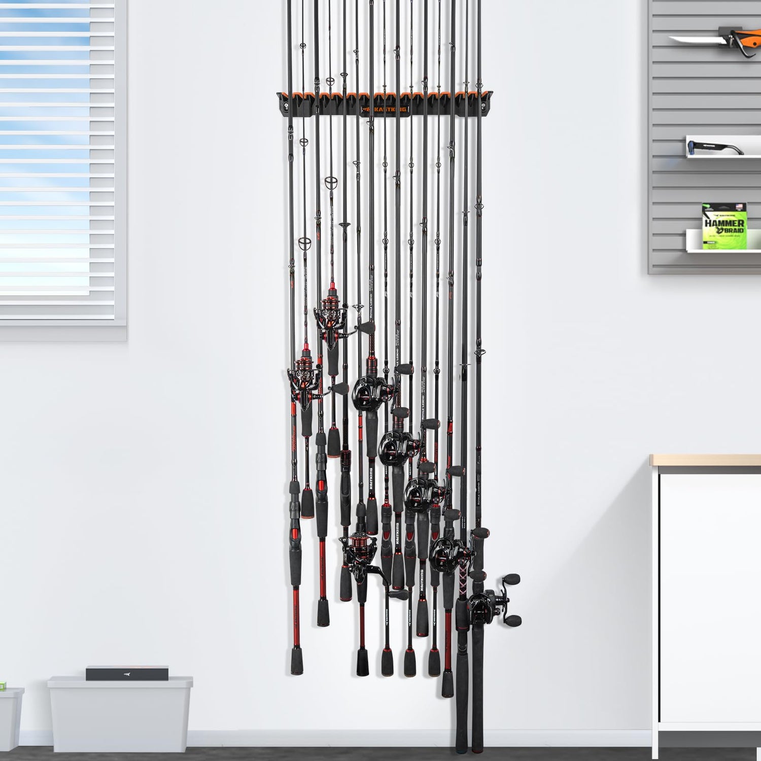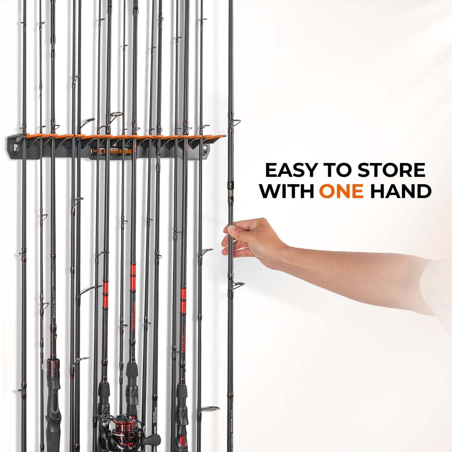 - KEY FEATURES : Store up to 15 fishing rods or fishing rod and reel combos in less than 18” of wall space, Innovative Design fishing pole holder is easy to use, Easy installation with only 3 screws