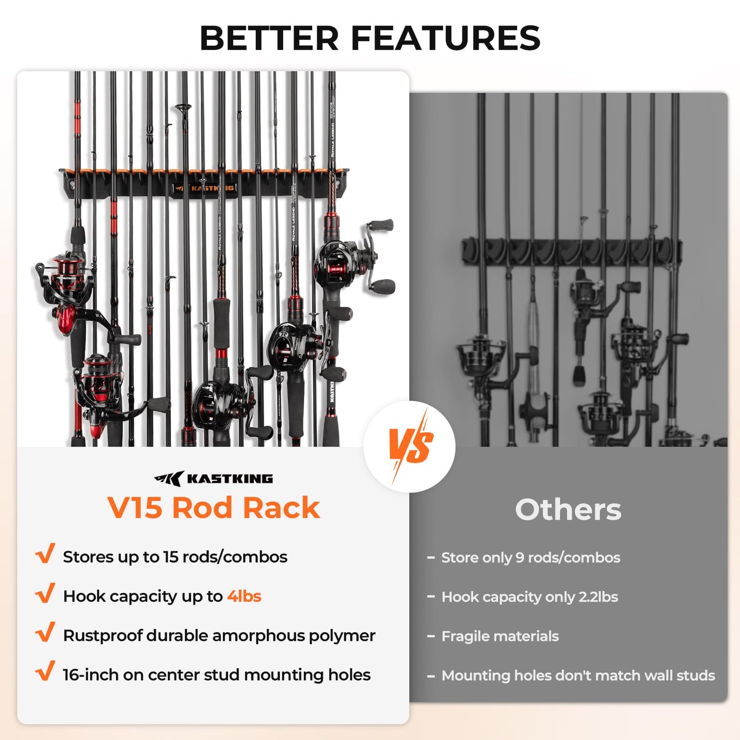 - STORE 15 RODS OR COMBOS: The V15 vertical fishing rod rack can store up to 15 rods or combos in less than 18 inches of wall space. Most other brands only store 6 combos in the same amount of space
