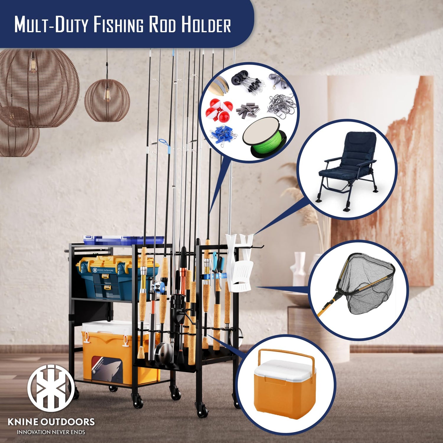 KNINE OUTDOORS Garage Fishing Pole Holders - 12 Rod Holders, 3 Layers of Storage Space for Fishing Gear and Equipment