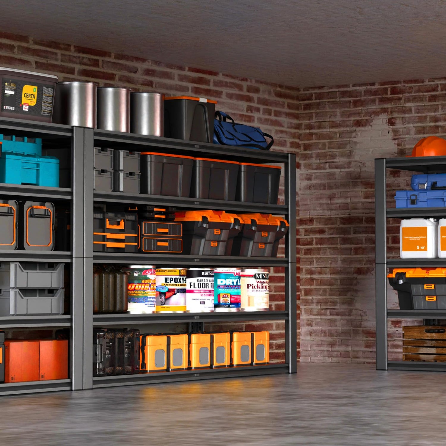 - 【2500LBS Metal Shelving with Reinforced Structure】 Built with double-layer steel columns, 5 reinforcing ribs, and a strengthened crossbeam, this shelving unit supports 2500LBS total weight , 500LBS per shelf (uniformly distributed load). Its robust frame, paired with 16 anti-slip foot pads, ensures wobble-free stability for garages (heavy tools), warehouses (cargo), and pantries (bulk items). A premium powder coating adds durability, making it a reliable choice for heavy duty garage shelving that handles tough storage needs with ease.