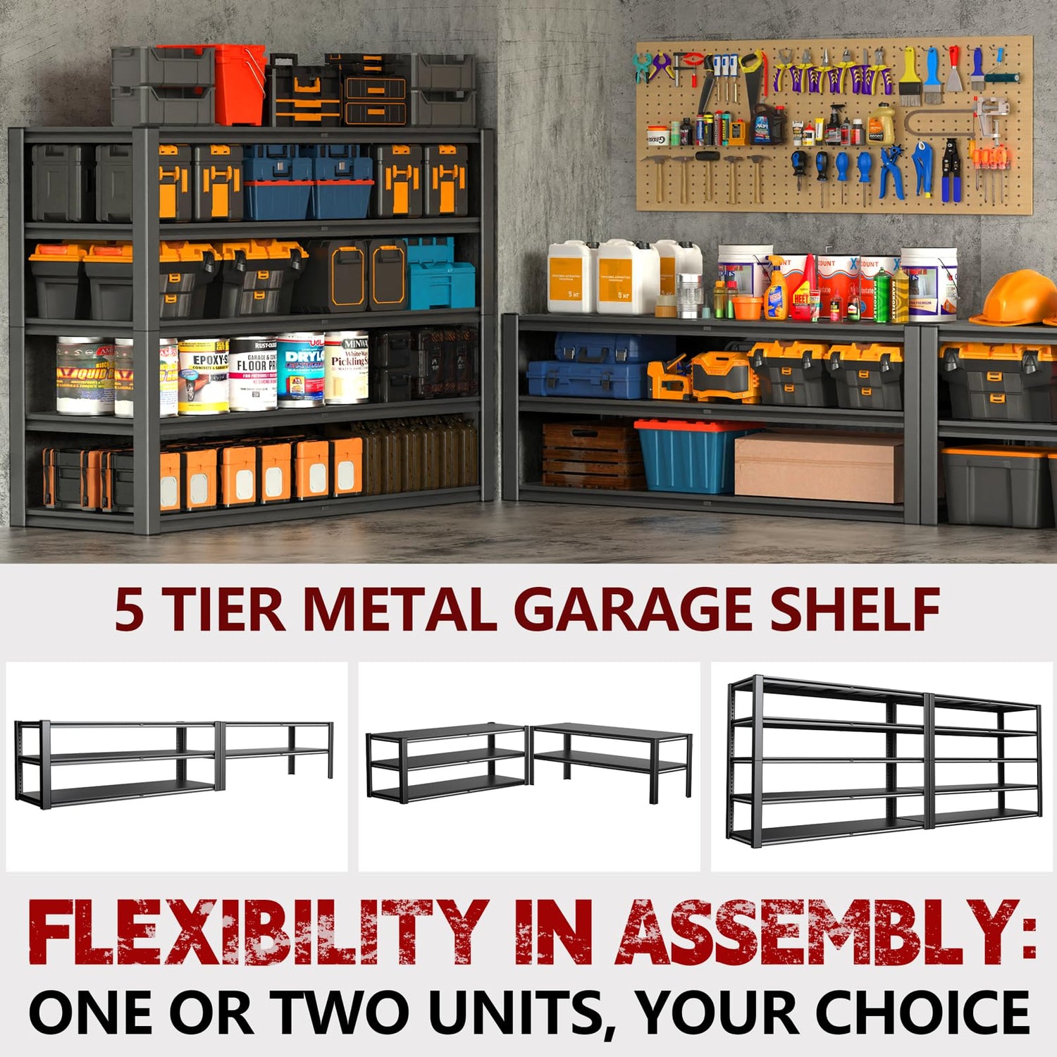 - Adjustable Storage shelving for Custom Storage The standing shelves are highly adjustable. The vertical poles with 1.4-inch spaced grooves and holes allow for custom height adjustments. You can easily change the crossbar position to fit items of varying heights letting you customize heights for tall 27-gallon bins, generators, or compact toolboxes. And with the ability to divide one shelf into 3-tier + 2-tier configurations, you have endless possibilities for organizing your space. Make your warehouse storage work for you.