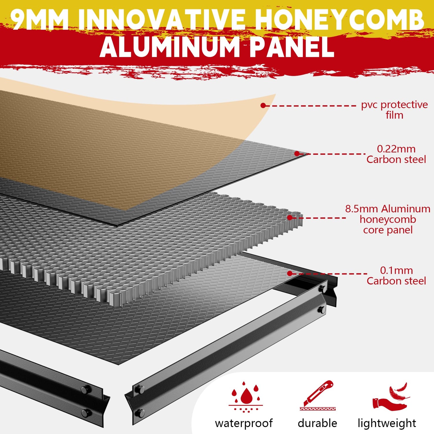 - Garage Shelf with 3000 lbs Total Capacity: Each tier holds up to 600 lbs (uniformly distributed load), with total loading capacity of 3000lbs.The self-weight of the panel is lightw, resulting in less vertical pressure on the supporting structure.The structural rigidity of the honeycomb core makes the load distribution more even, and the stress on the supporting points is more balanced. It could improve the overall stability and durability