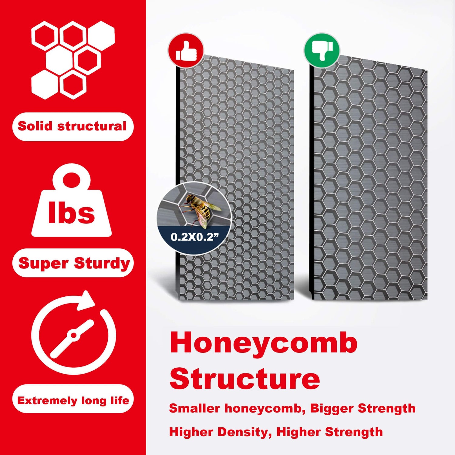 - Heavy-Duty Shelving with Aluminum Honeycomb Shelves: Built with a rugged iron frame and 9mm innovative metal aluminum honeycomb panels, this commercial-grade shelving unit combines industrial high strength with lightweight portability. The hexagonal honeycomb shelf features better compressive and bending resistance than metal shelves. There is no need to worry about the middle part of the shelf panel sinking and deforming due to the long-term pressure of heavy objects