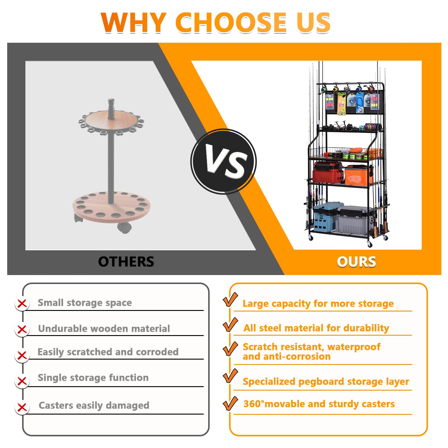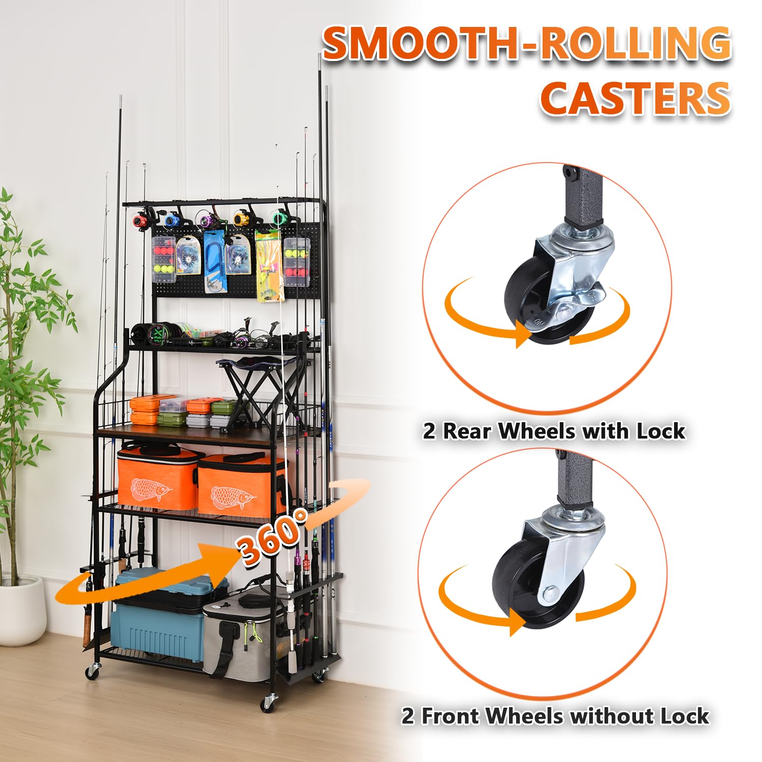 • Effortless Mobility & Secure Parking: The fishing pole holder boasts four 360° silent-rolling casters, two with locking brakes. Glide it effortlessly for easy repositioning; engage the brakes for instant stability. Offers unmatched convenience for organizing indoors or relocating to your perfect outdoor fishing spot.