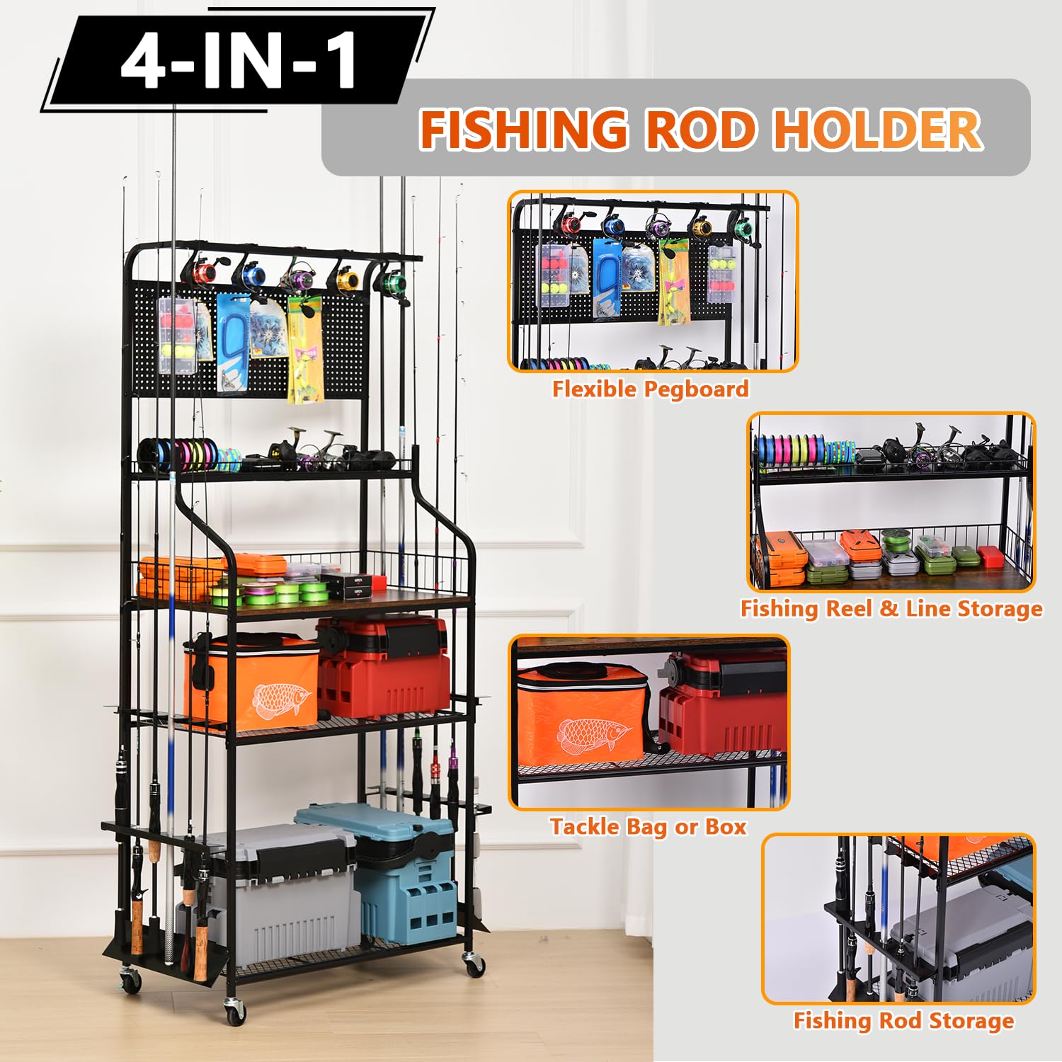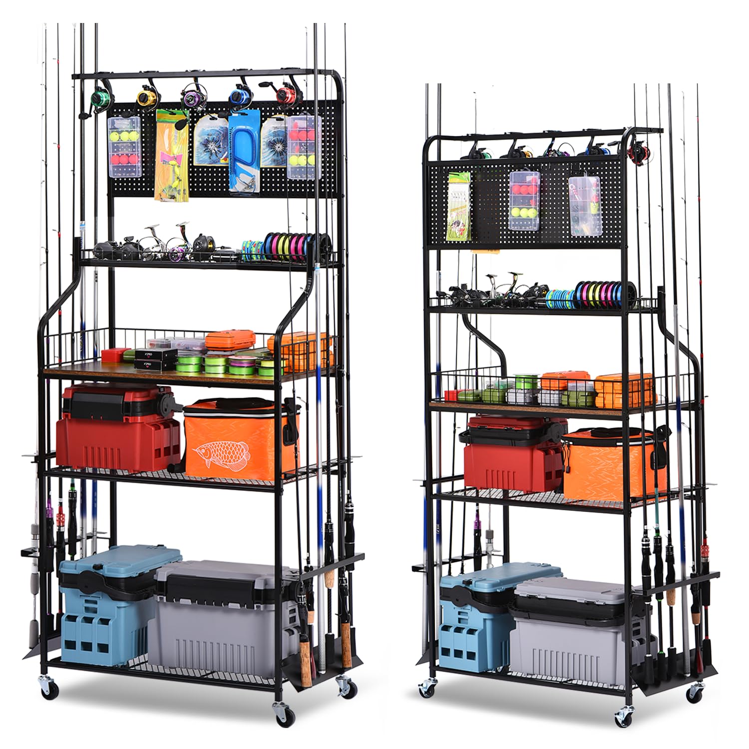 • Heavy-Duty & Secure Storage: The fishing rod holder is constructed from premium thickened steel for exceptional load-bearing capacity and rock-solid stability. Three oversized, deep shelves with guardrails ensure your fishing rods, tackle boxes, bait buckets, and heavy gear are stored securely and organized, preventing tipping and slippage.