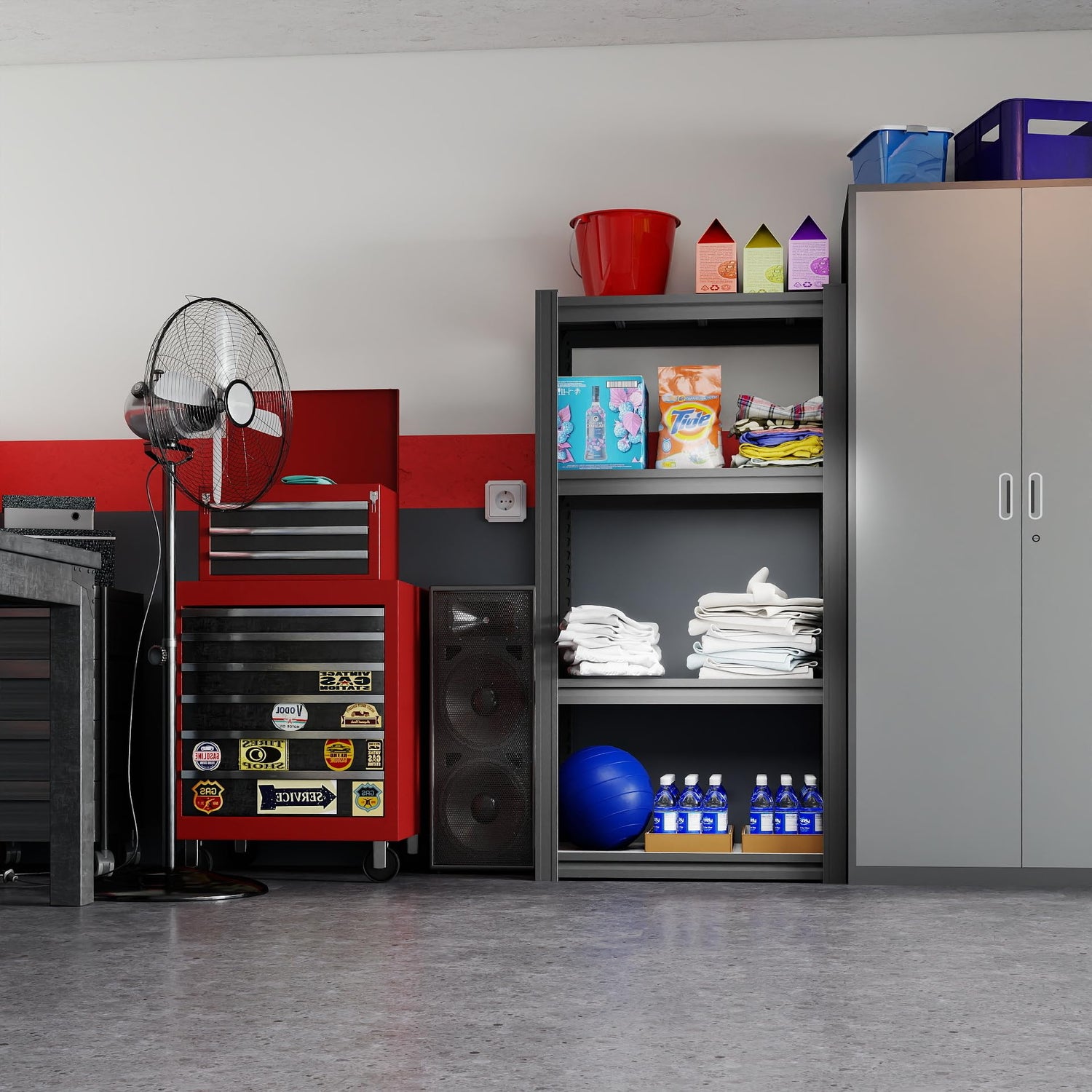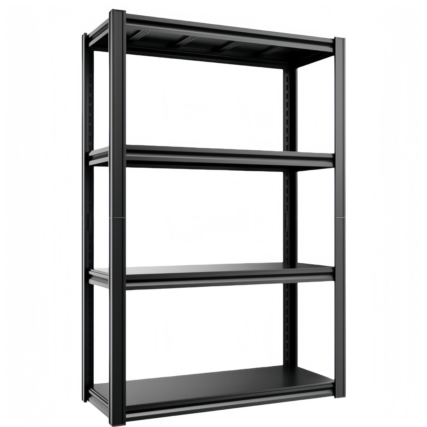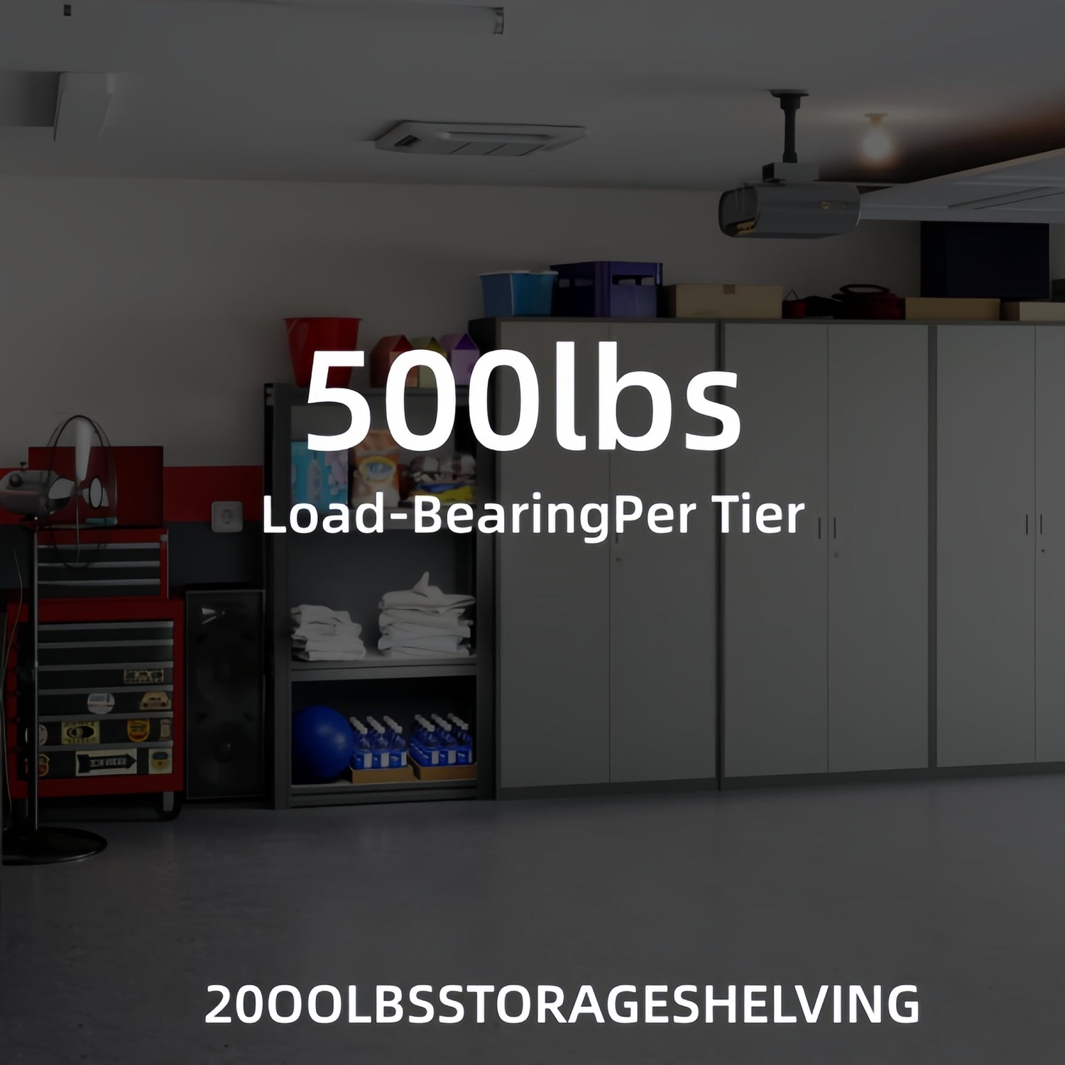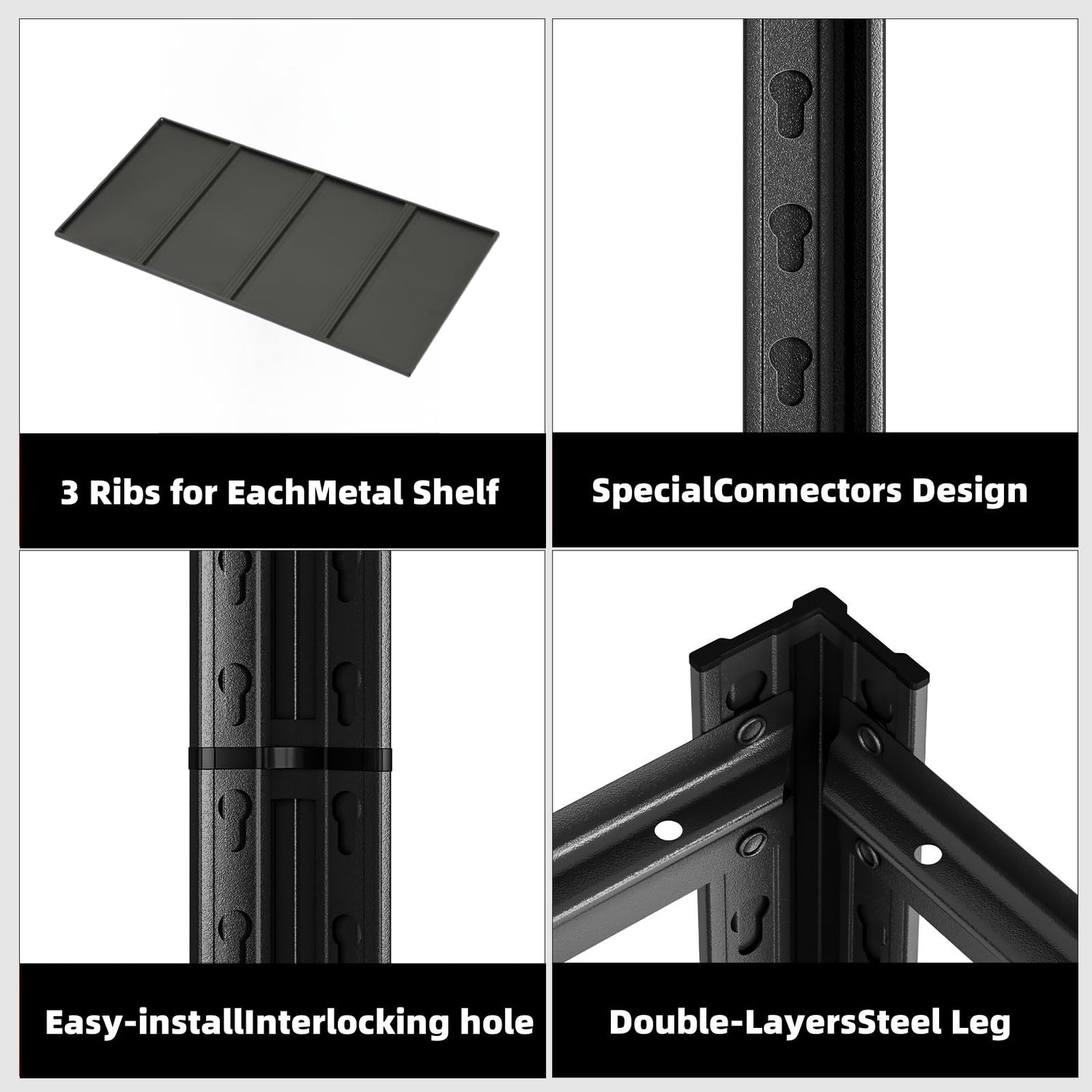 - 4 Tier Metal Shelf Unit: The garage shelves are constructed with reinforced, double-layered uprights that deliver exceptional load-bearing capacity, ensuring long-term use and stability. Each shelf incorporates 3 reinforcing rods , enhancing stability and ensuring even weight distribution for the safe storage of heavy items.