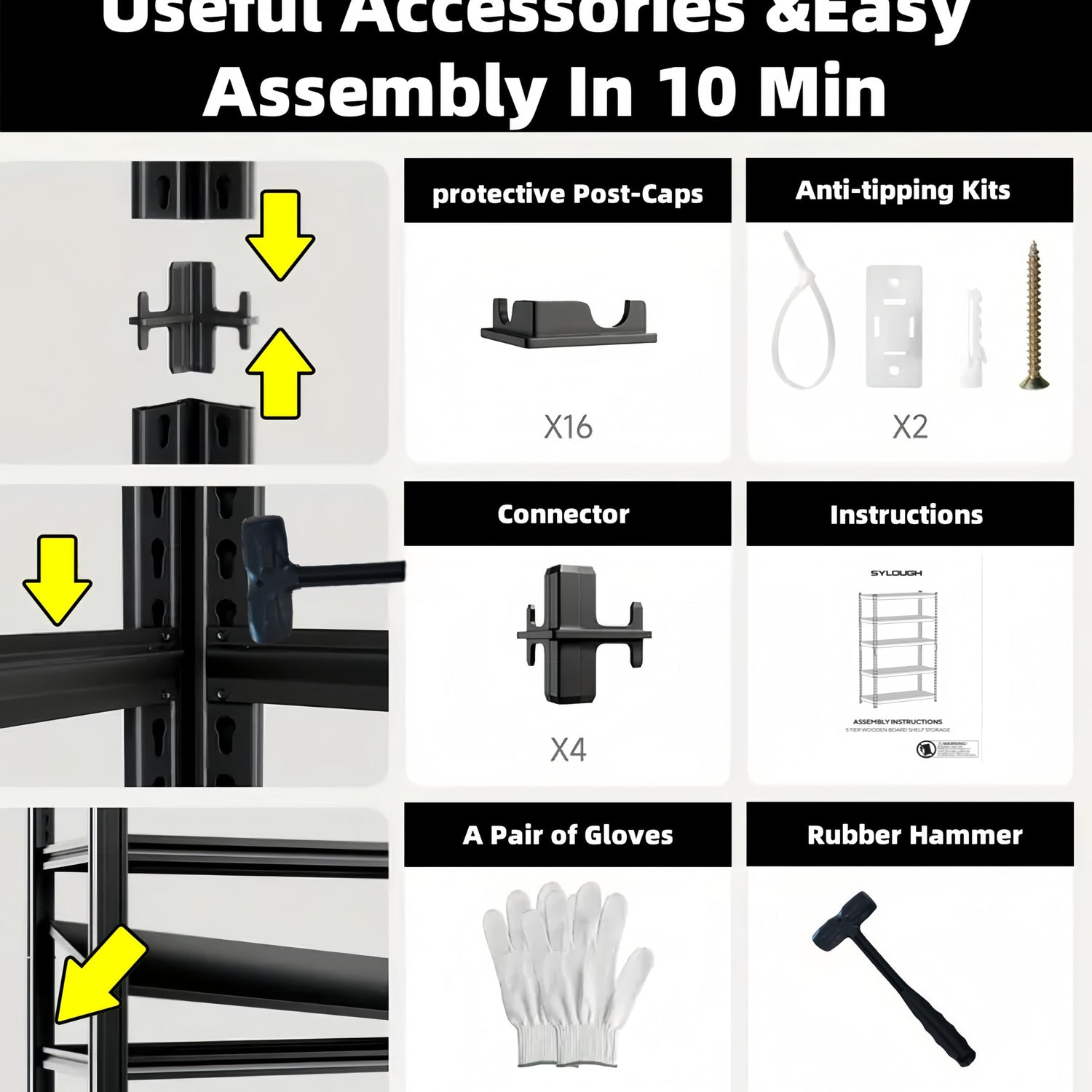 • 【Easy Assemble within 10 Minutes】To help you quickly assemble, we offer you a hammer and a pair of gloves. There is no nuts or bolts required, you can quickly assemble every stand alone sturdy shelves for storage within 10 minutes alone