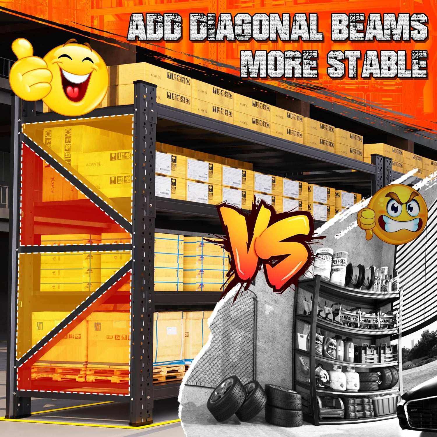 - Ultra-Stable Heavy Duty Garage Shelving: This 4-tier all-steel heavy duty shelving features a continuous upright column design with seamless connections, significantly reducing risks from loose joints. Reinforced diagonal braces distribute weight evenly, ensuring rock-solid stability even when bearing loads up to 6,000 lbs. This metal shelving provides the most solid support for your garage storage, giving you complete peace of mind