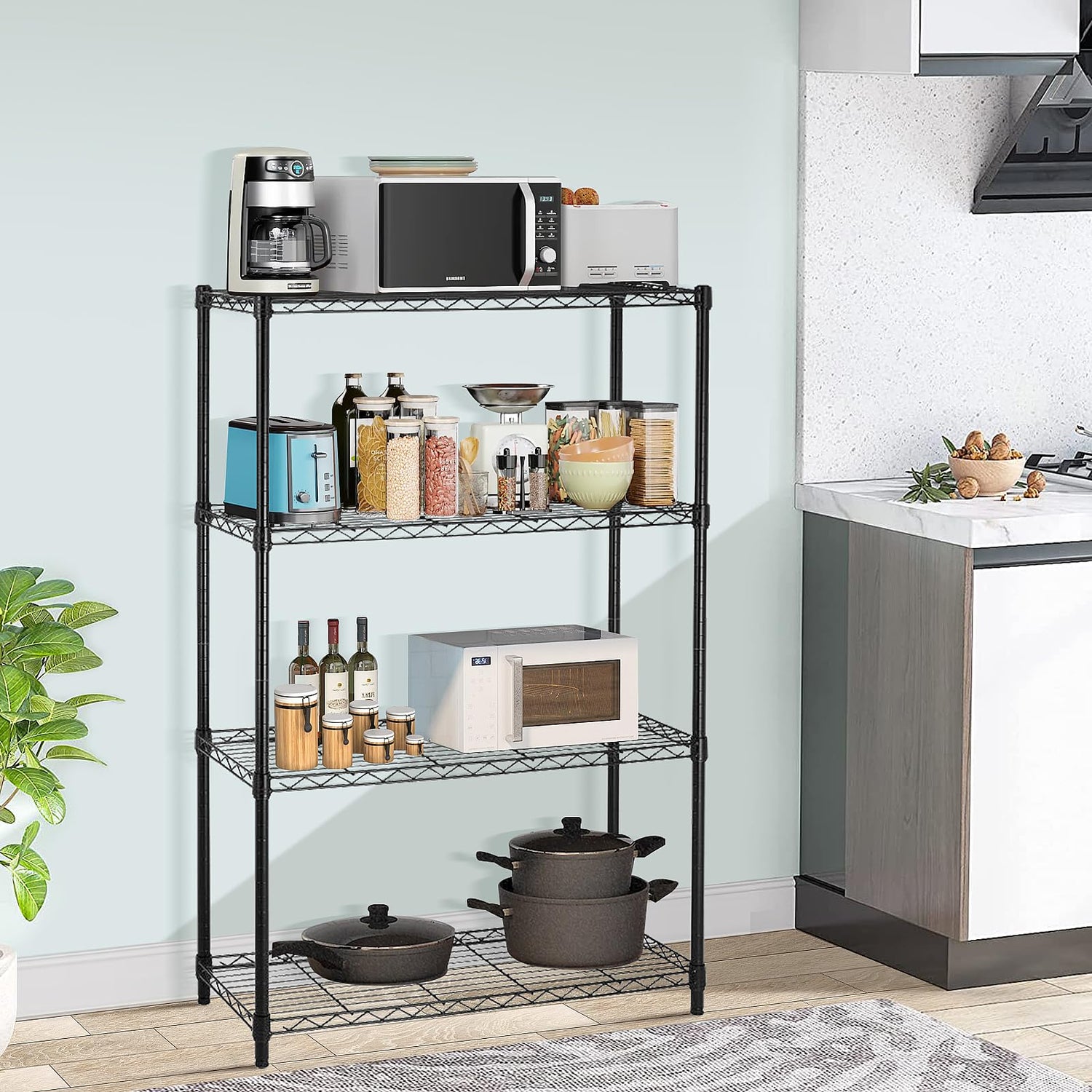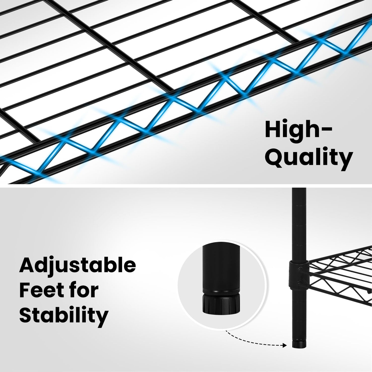 • STURDY CONSTRUCTION - Metal shelf rack are made of heavy steel, sturdy and stable. The surface is coated with high quality powder coating, which has excellent rustproof and waterproof ability. Shelving unit for the kitchen and laundry room are no problem