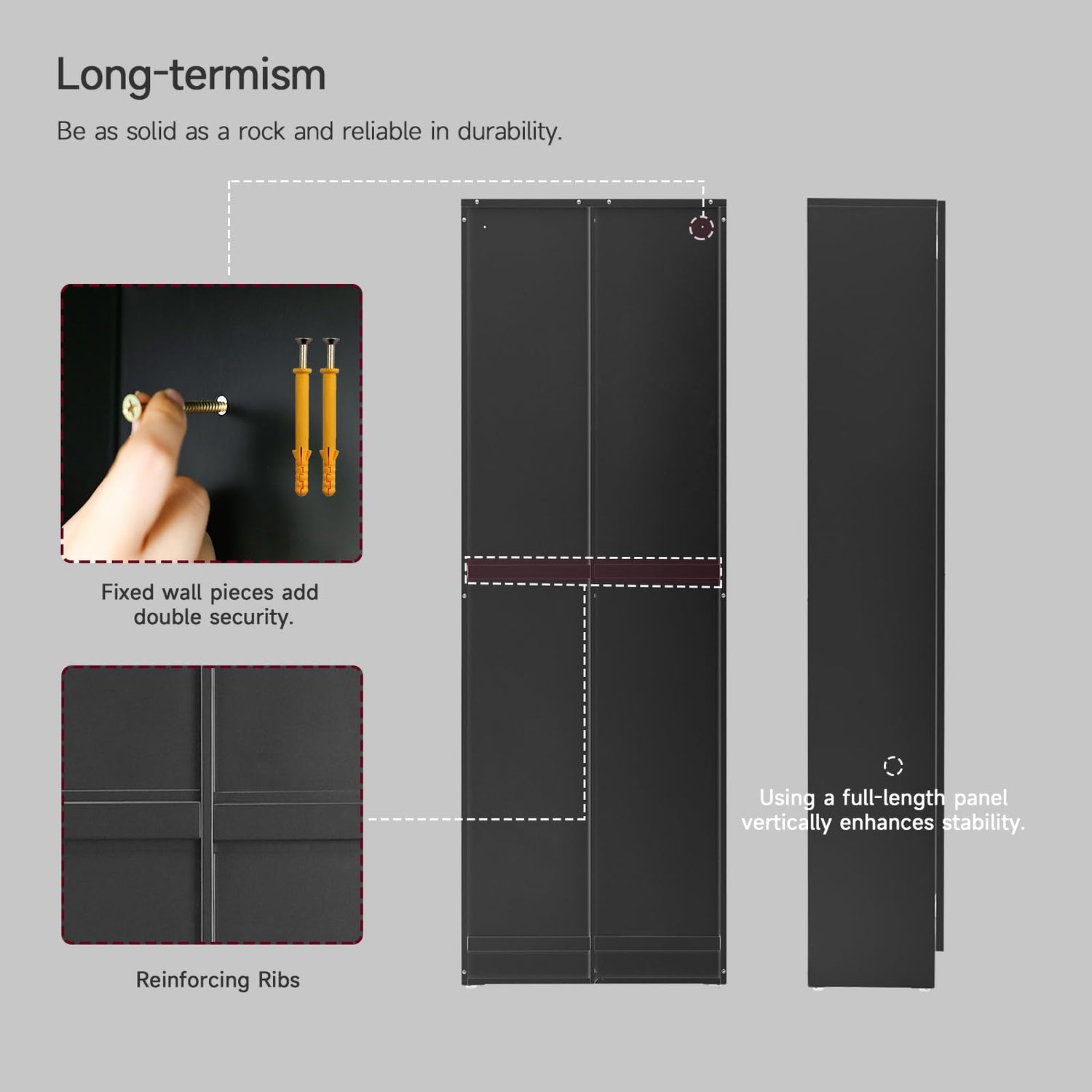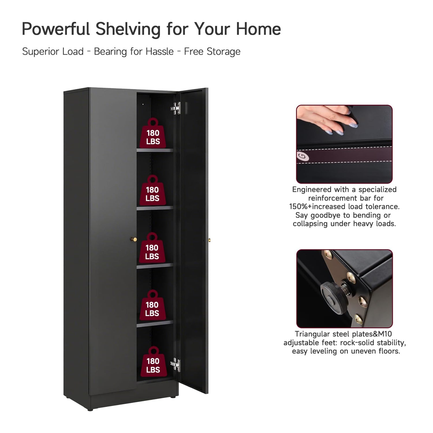 • Flexible Storage Solution:Equipped with four standard adjustable shelves that can be easily modified to accommodate the varying heights of items. Measurement of 14"D x 23.54"W x 71"H offers ample large storage space on 5 tiers. Each shelf of storage cabinet with doors and shelves can bear a weight of 180 LBS, making it perfect for storing books, documents, kitchen utensils, household items, and garage tools