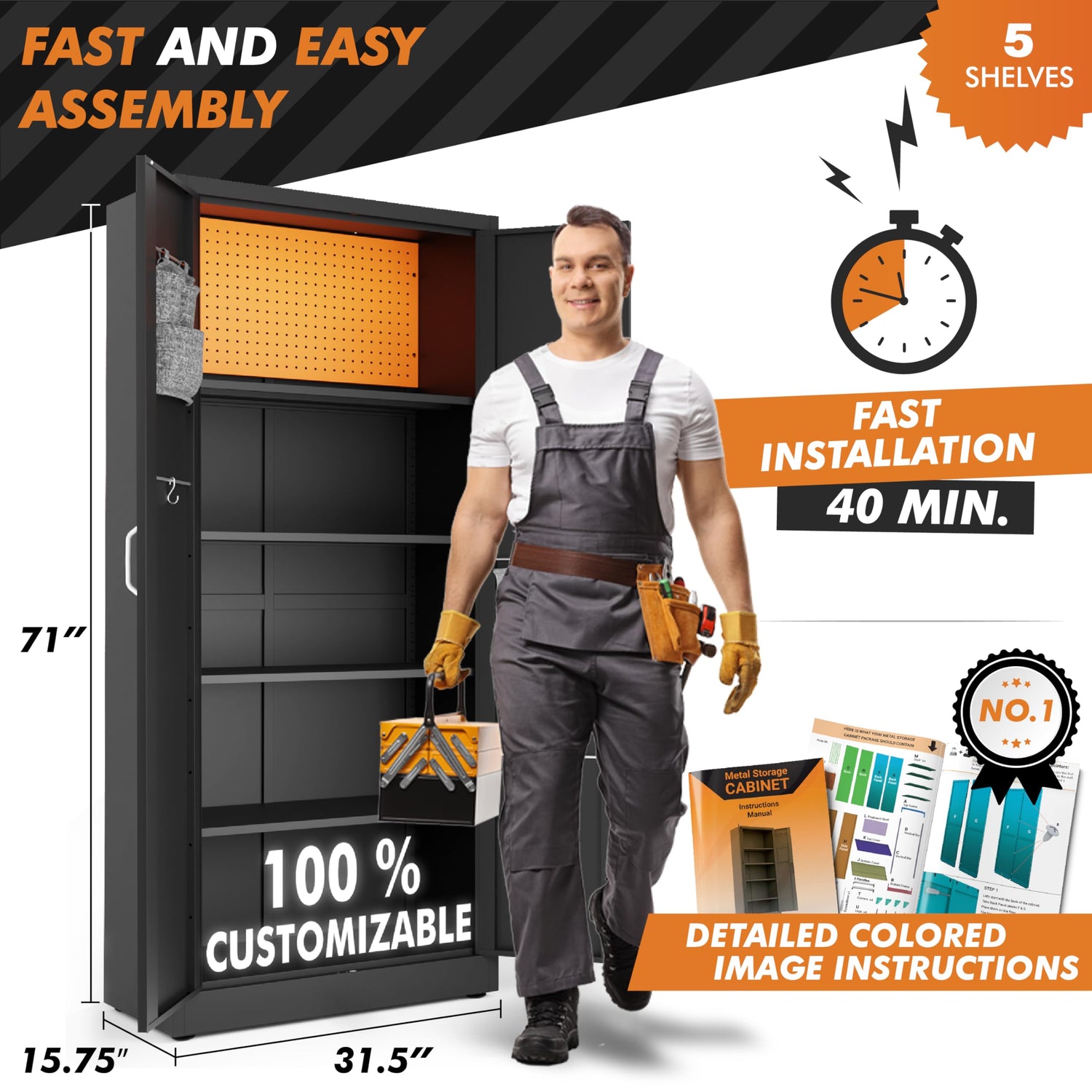 METALTIGER Metal Storage Cabinet with Digital Lock | Garage Storage Cabinet | Pegboard | 71" Lockable Tool Cabinet | Locking Cabinets (Black)