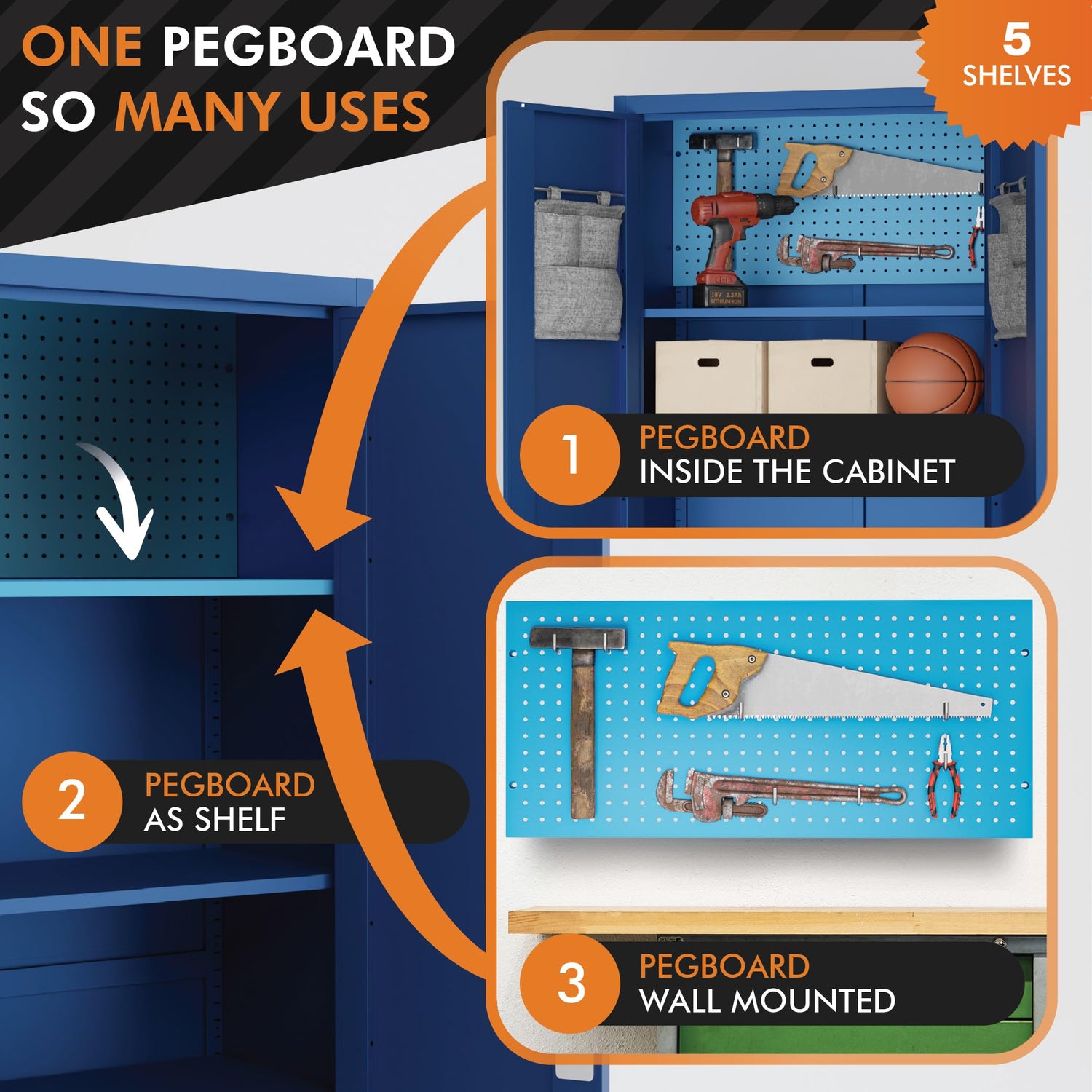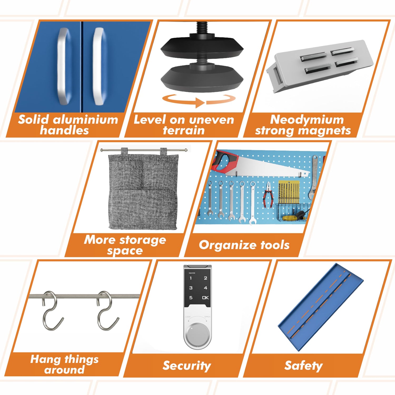 - Convenience at Its Best: Inside the cabinet with lock you can find a pegboard for easy tool organization, solid aluminium high-quality handles, and a variety of included accessories such as hooks and a textile pocket, our locked cabinet is designed for maximum convenience and functionality and can be used even as a metal locker storage cabinet.