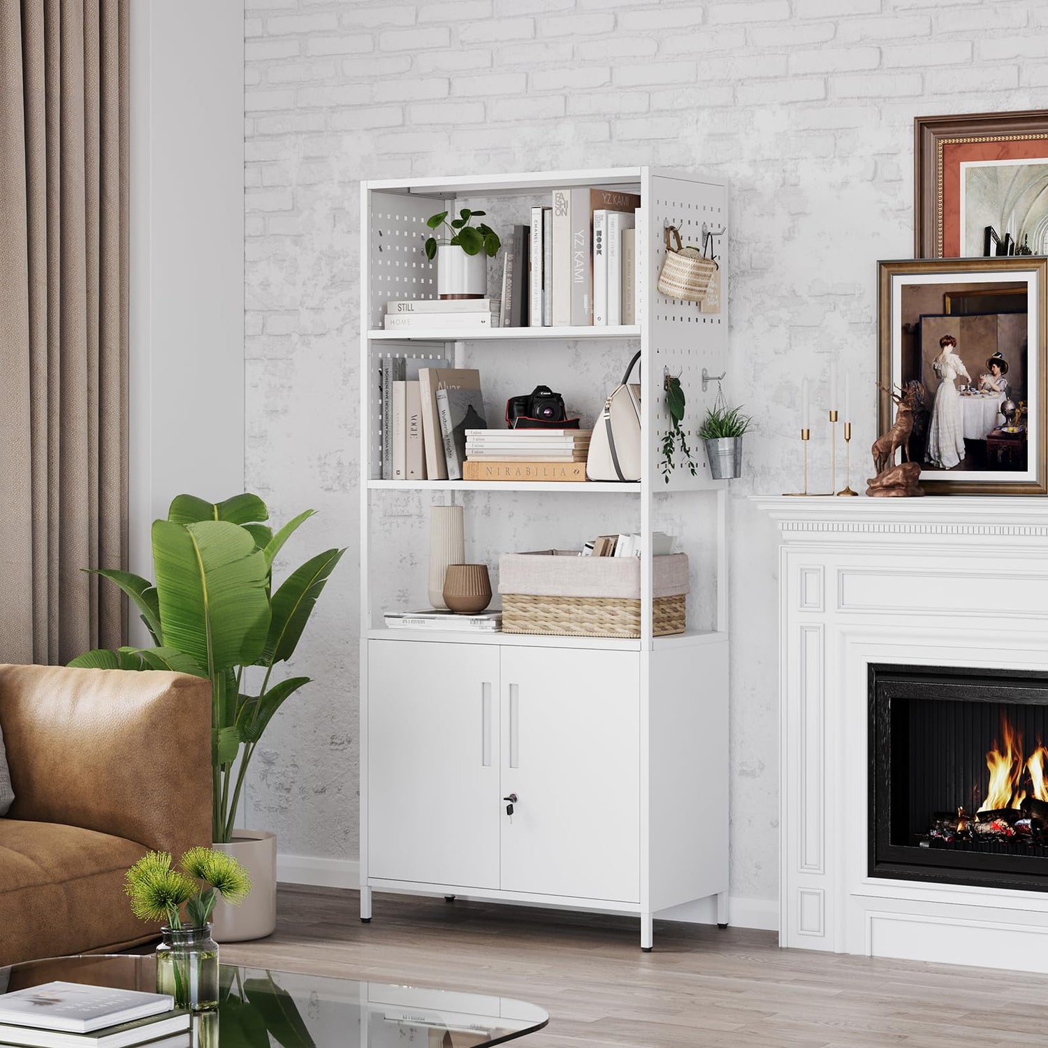 - 【Bookcase Storage Rack】: The 5 Tier metal storage Rack is equipped with locking cabinet, 4 shelves, 2 pegboards and 8 hooks. Each shelf holds 120 lbs, perfect for storing books, tools, household items, cleaning supplies, files and more. Base 2 door locking cabinet can place kinds of stuff and your provite items inside for security.