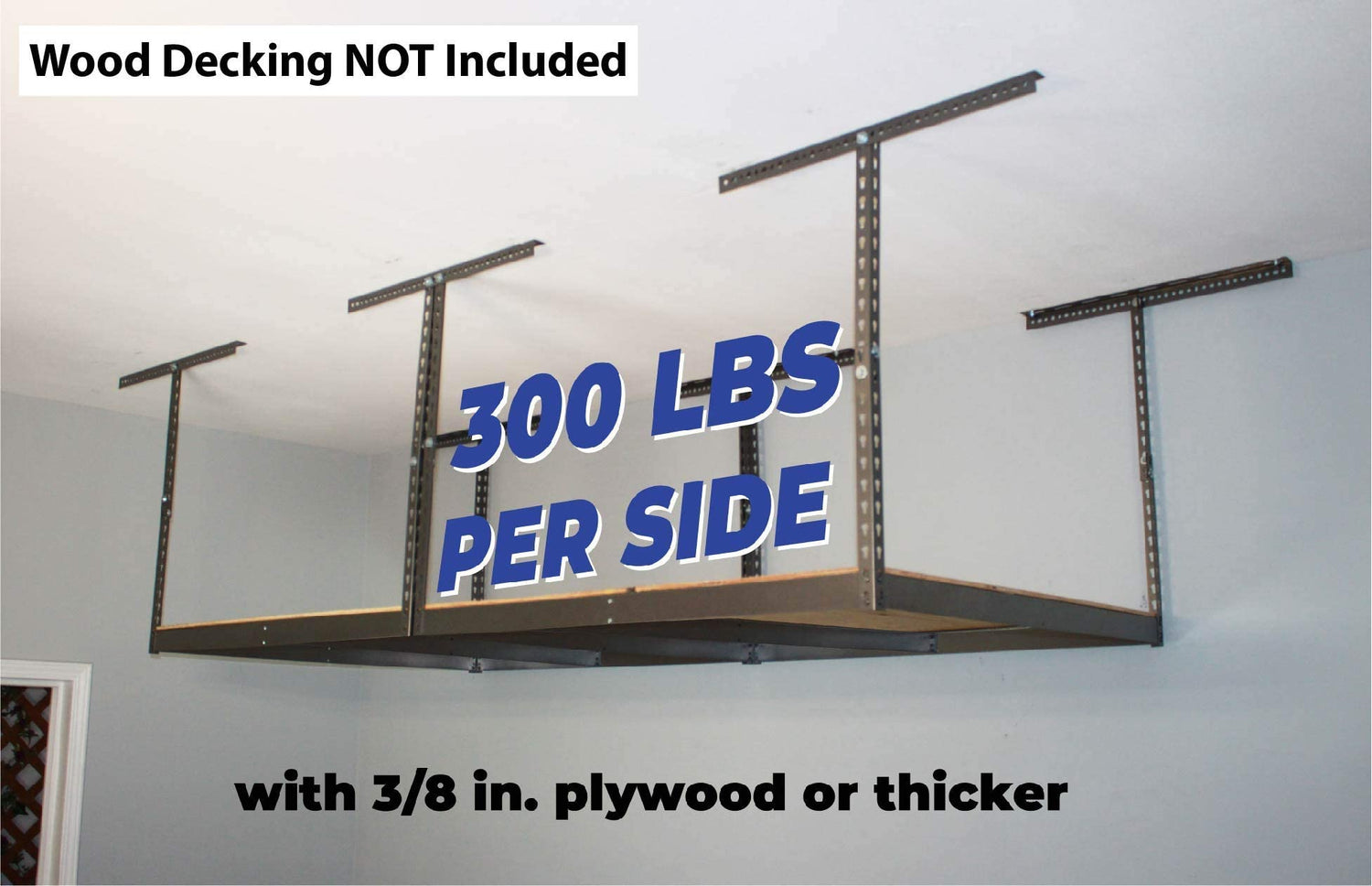 How it Works: We removed the wire decking units from our best-selling rack to cut costs for the customer and improve the user experience. This unit DOES NOT include any decking components. Customer is required to supply adequate decking material. 600lb TOTAL weight capacity between two 4'x4' overhead rack units, when using high quality 3/8" thick plywood. Two 4'x4' plywood sheets are required.