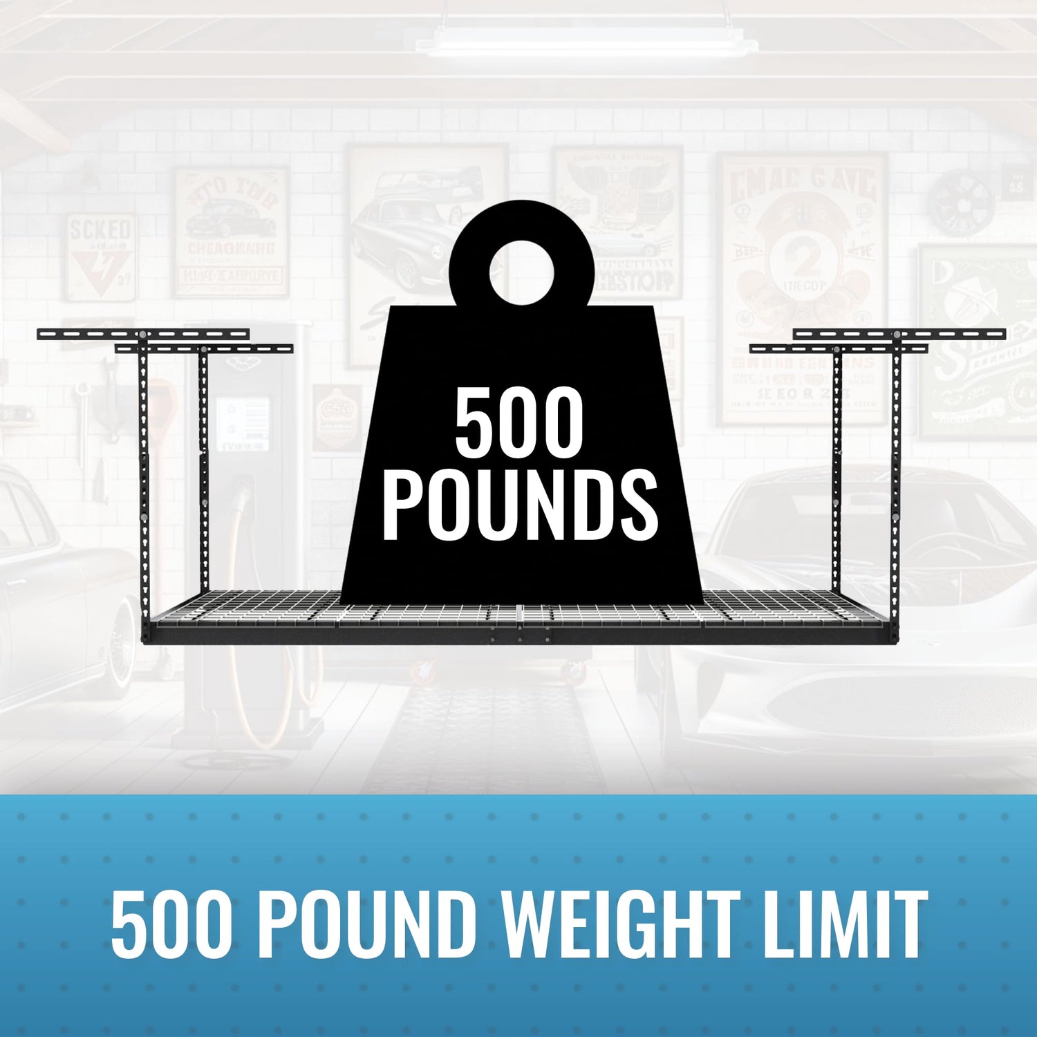 - INDUSTRIAL STRENGTH RACKS: Our industrial strength garage ceiling storage rack is designed to hold up to 500 lbs and is perfect for storing bikes, construction tools, storage bins, holiday decorations, and other items and accessories. The powder coat finish provides a durable, scratch, water, and rust-resistant surface; while case-hardened hardware and our patented ceiling brackets provide additional strength and safety for this hanging shelf.