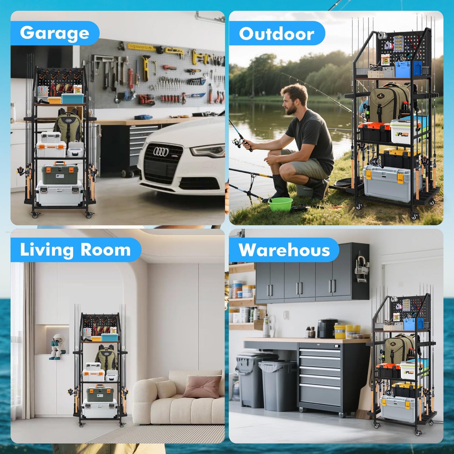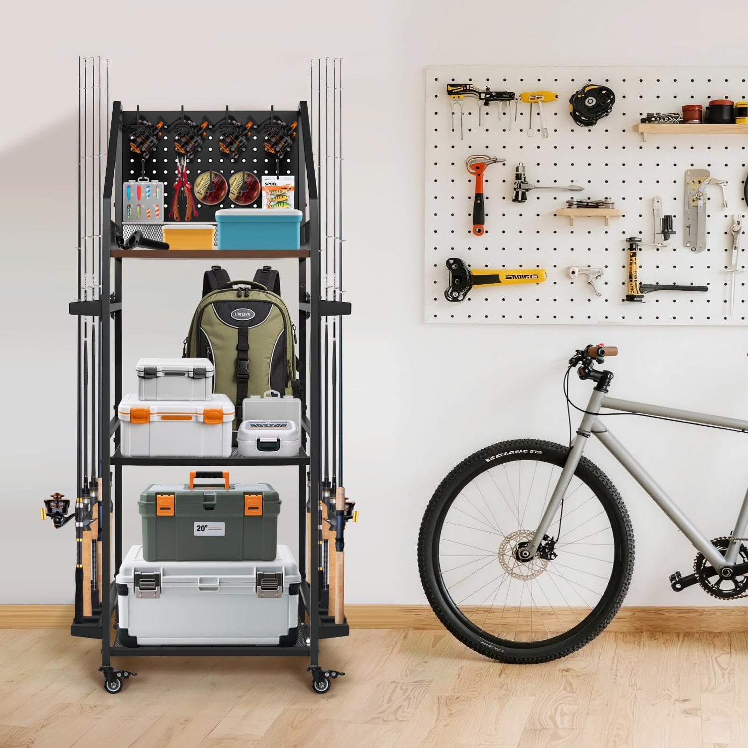 • All-in-One Fishing Storage Solution – The fishing rod holders for garage features 3 spacious tiers, dedicated rod holders, and a pegboard with hooks to organize reels, tools, lines, lures, gloves, and accessories with ease. Keep essentials within reach. And your fishing station is always ready to go