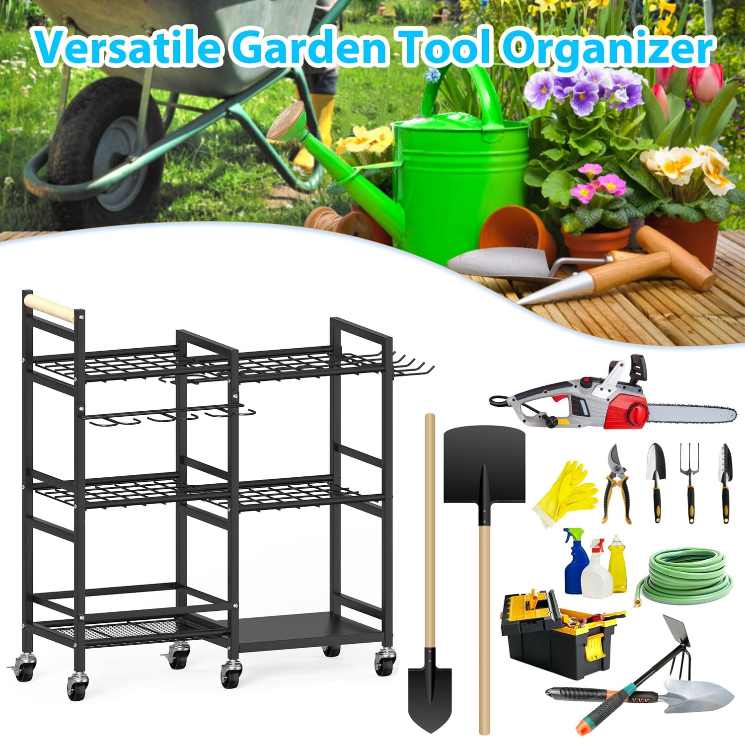 NADAMOO Garden Tool Organizer with Rolling Wheel, 3-tier Metal Shelf Yard Tool Holder, Utility Stand Rack for Garage Organization and Storage, Hold Long-Handled Rakes, Shovel, Broom