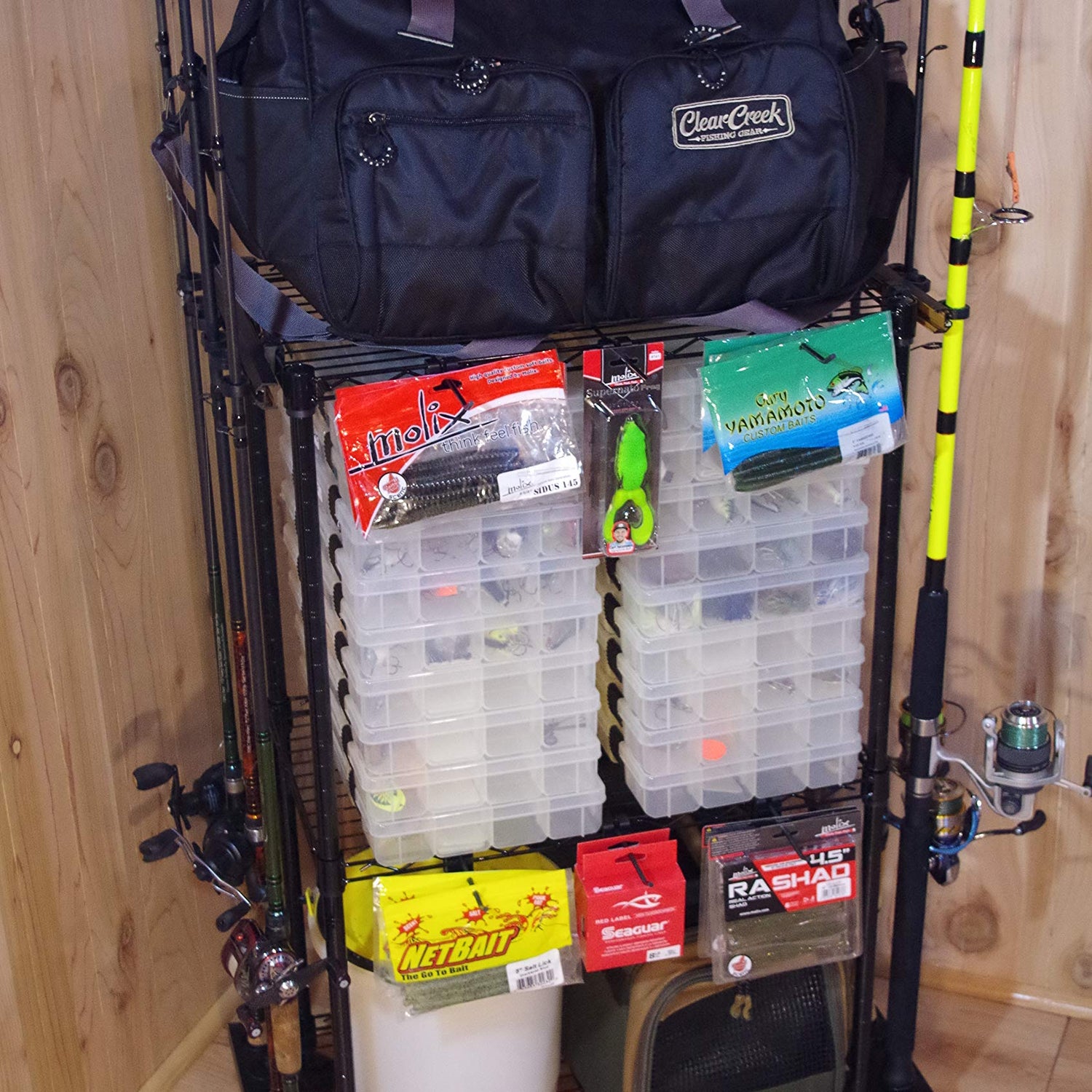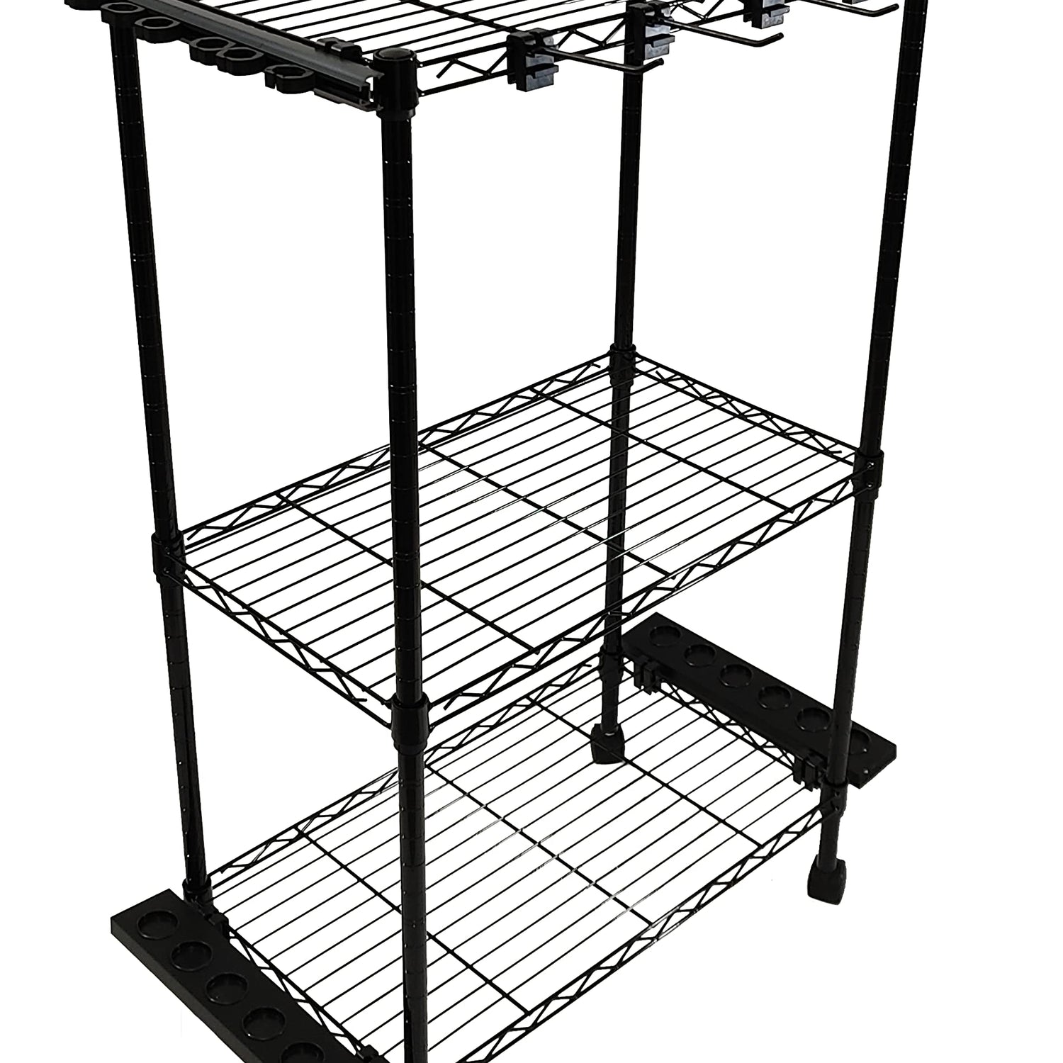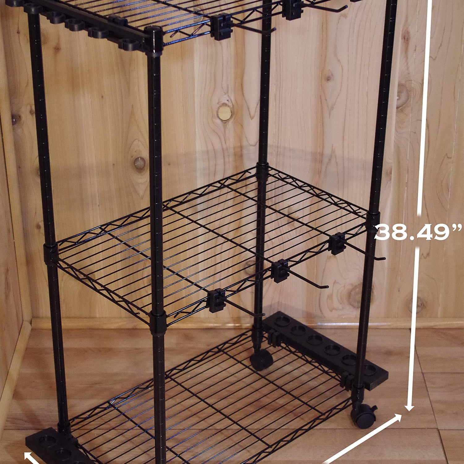 Details: The Tackle Trolley Is The Ultimate In Rod And Tackle Storage! Each Shelf Holds Up To 35 Pounds, And The Adjustable Clips Allow For Custom Spacing. The Snap On Rod Holders Can Be Placed On The Sides, Or Back And Secure Upto 12 Combos. Rubber Clips Secure The Rods In Place. Features Two Locking Wheels Which Stabilize The Unit When Locked. When Not Locked, Allows For Easyaccess And Cleaning. Comes With 6 Peg Hooks; Ideal For Storing Extra Line, Baitsgear, Or Anything That Can Be Pegged. No Tools Required, And Easilys Screws Together.