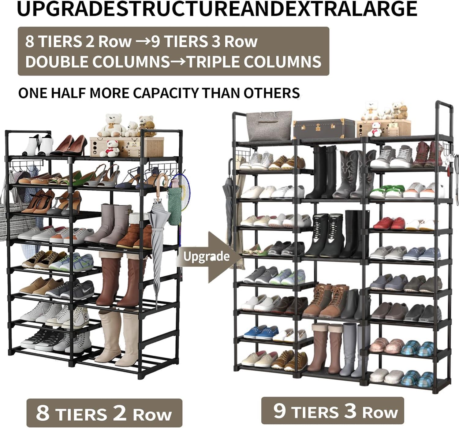 Piggy-G 9 Tiers Shoes Rack for Entryway, Shoe Organizer with Hook Rack, Shoe Storage Shelf Organizer Stackable Long Shoe Shelf for Hallway Entryway, Closet, Garage, Bedroom, Cloakroom