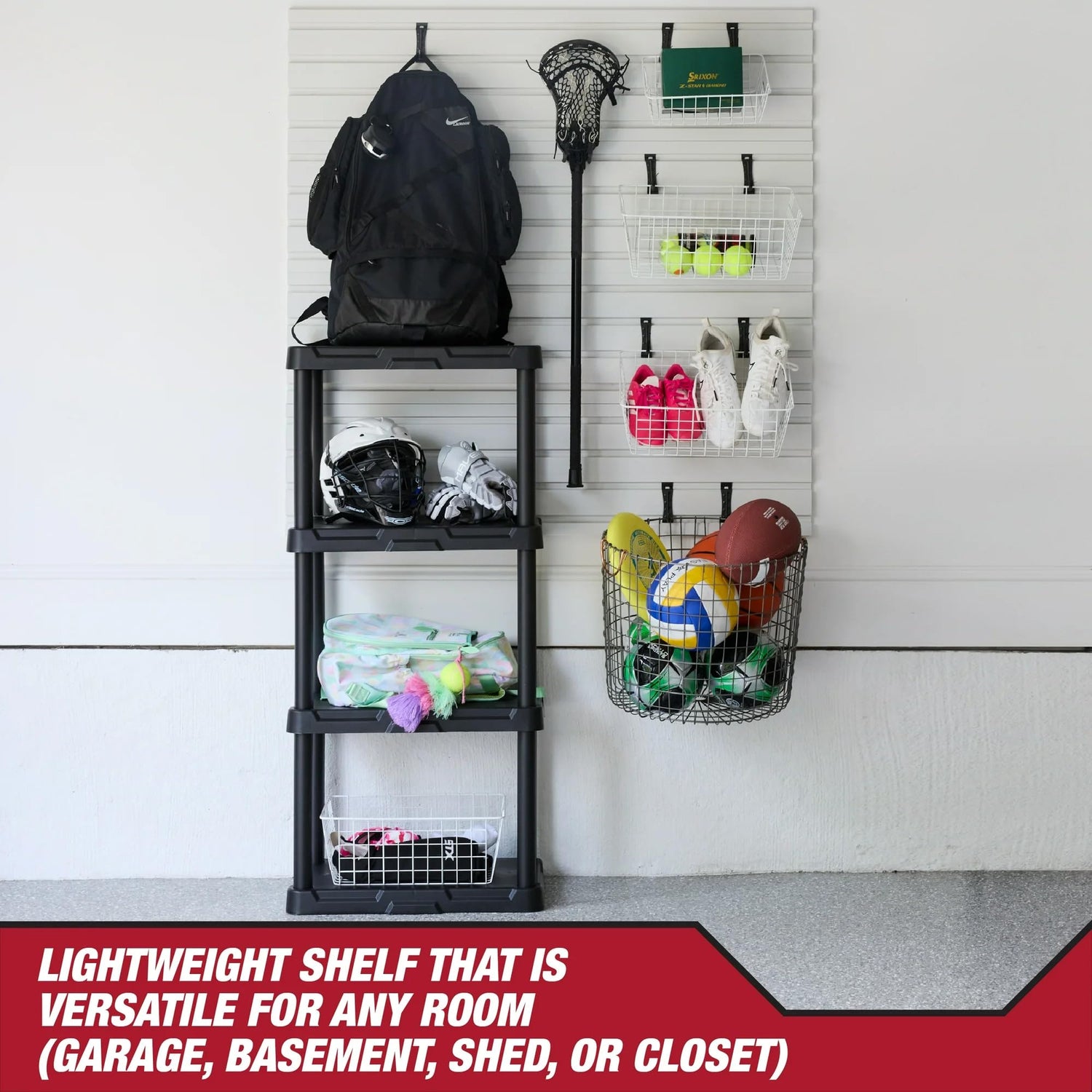 • 4-Tier Black Plastic Storage Shelf, 22" W x 14" D x 47" H, is perfect for your storage and organization needs in your home or in your garage.
