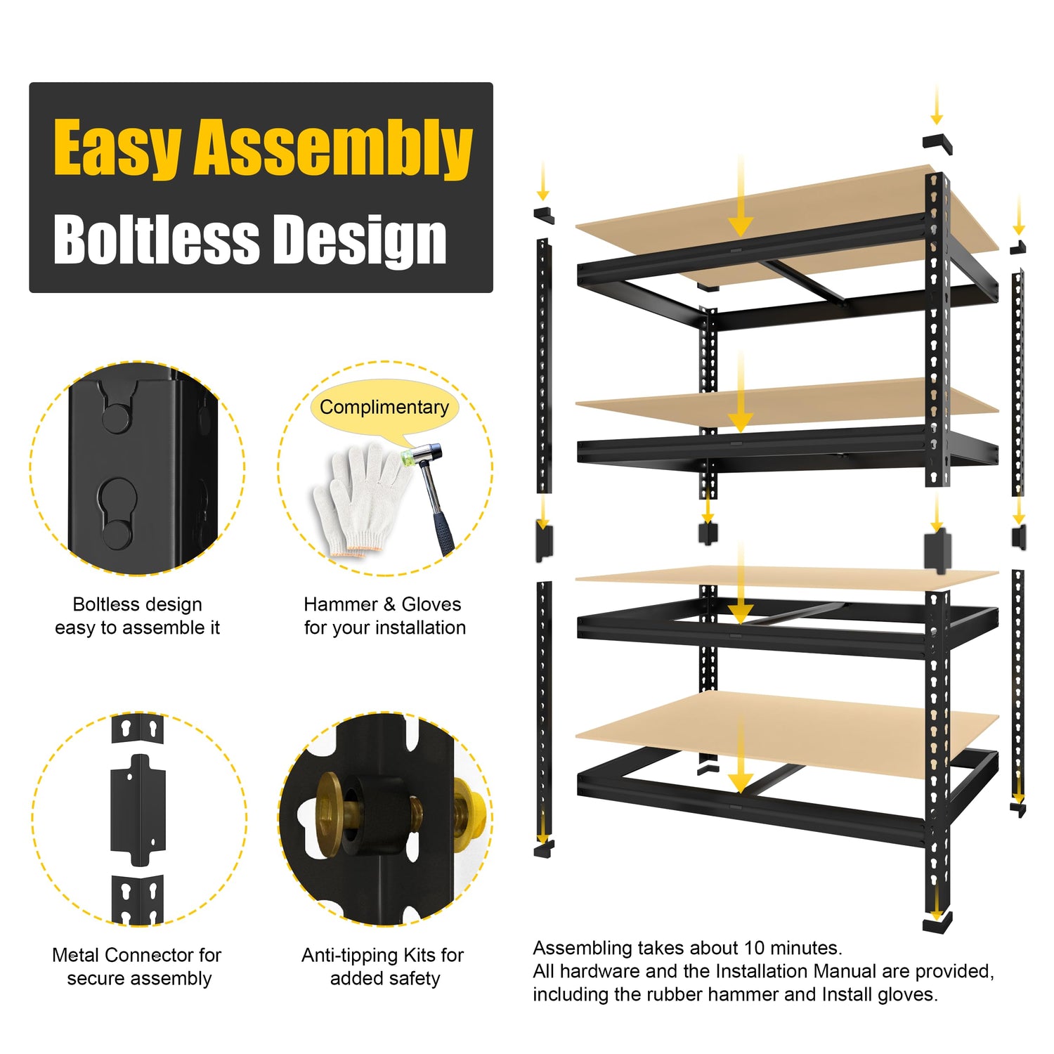 - 【Easy to Assemble 】Due to the boltless design, it is easy to assemble this heavy duty storage rack by lightly pressing it even with your hands or a rubber hammer. Assembling takes approximately 10 minutes. All hardware and the Installation Manual are provided, including the rubber hammer and gloves.