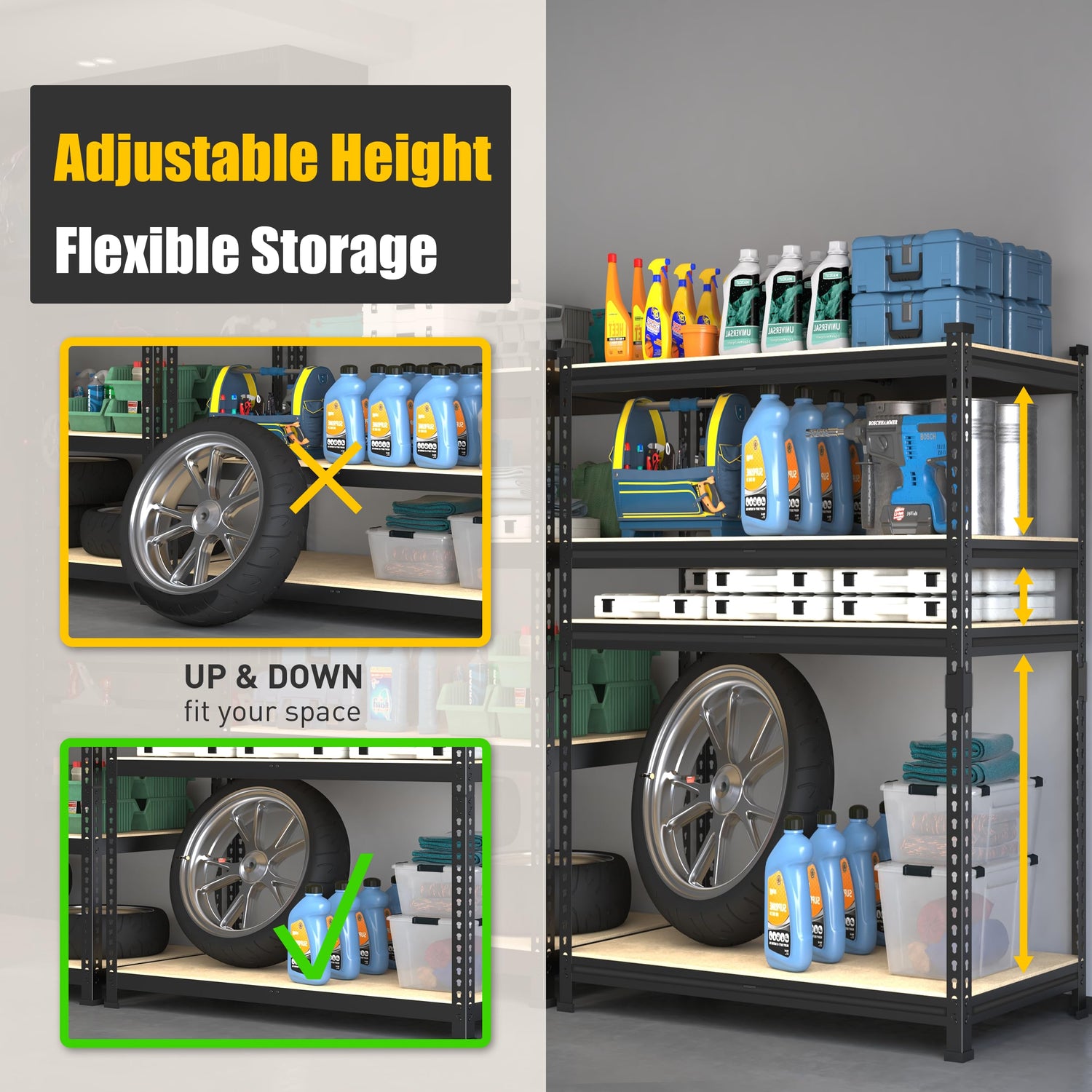 - 【Height Adjustable】Adjustable storage rack, metal shelving unit can be adjusted the shelf up and down, you can adjust each shelf heigh according to the size of the item so that the items can be stored in any size. (Adjustable at every 1.5 inches)