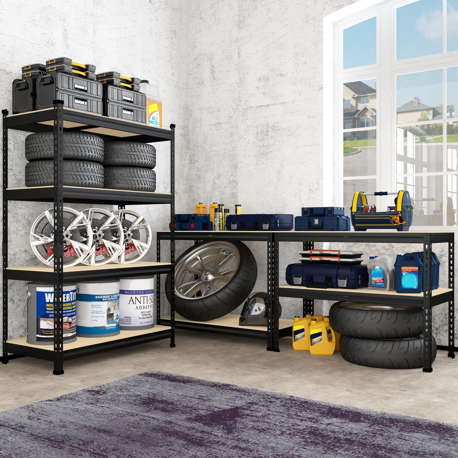 - 【 Heavy Duty & Long-lasting】This 4-tier garage shelving is made of high-quality thicker MDF boards and 0.03" thicker heavy duty galvanized metal frame, sturdy and ensuring. The metal frame is covered with premium powder coating to give it a smooth surface. Each shelf holds up to 400 lbs, 4 tier shelves' total max load weight is 1600 lbs