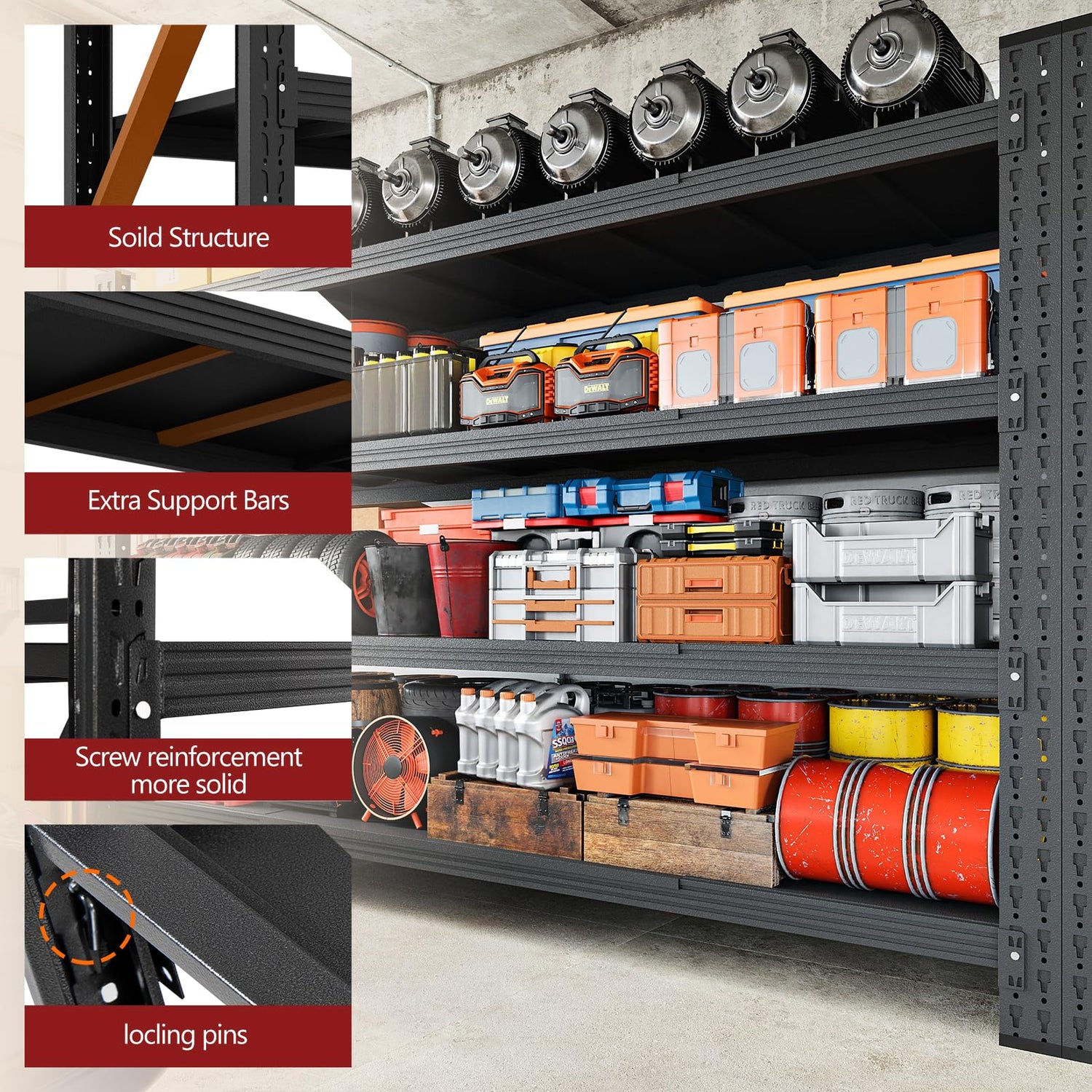 • 【ADJUSTABLE SHELVES & LOCKING PINS】Our Super Heavy-Duty Garage Shelving Unit features adjustable shelves that can be easily moved to accommodate items of different sizes. The locking pins also add an extra layer of security, preventing accidental disassembly and ensuring that your items remain safely stored. This user-friendly design makes our heavy-duty shelving unit a practical and convenient solution for a wide range of storage applications