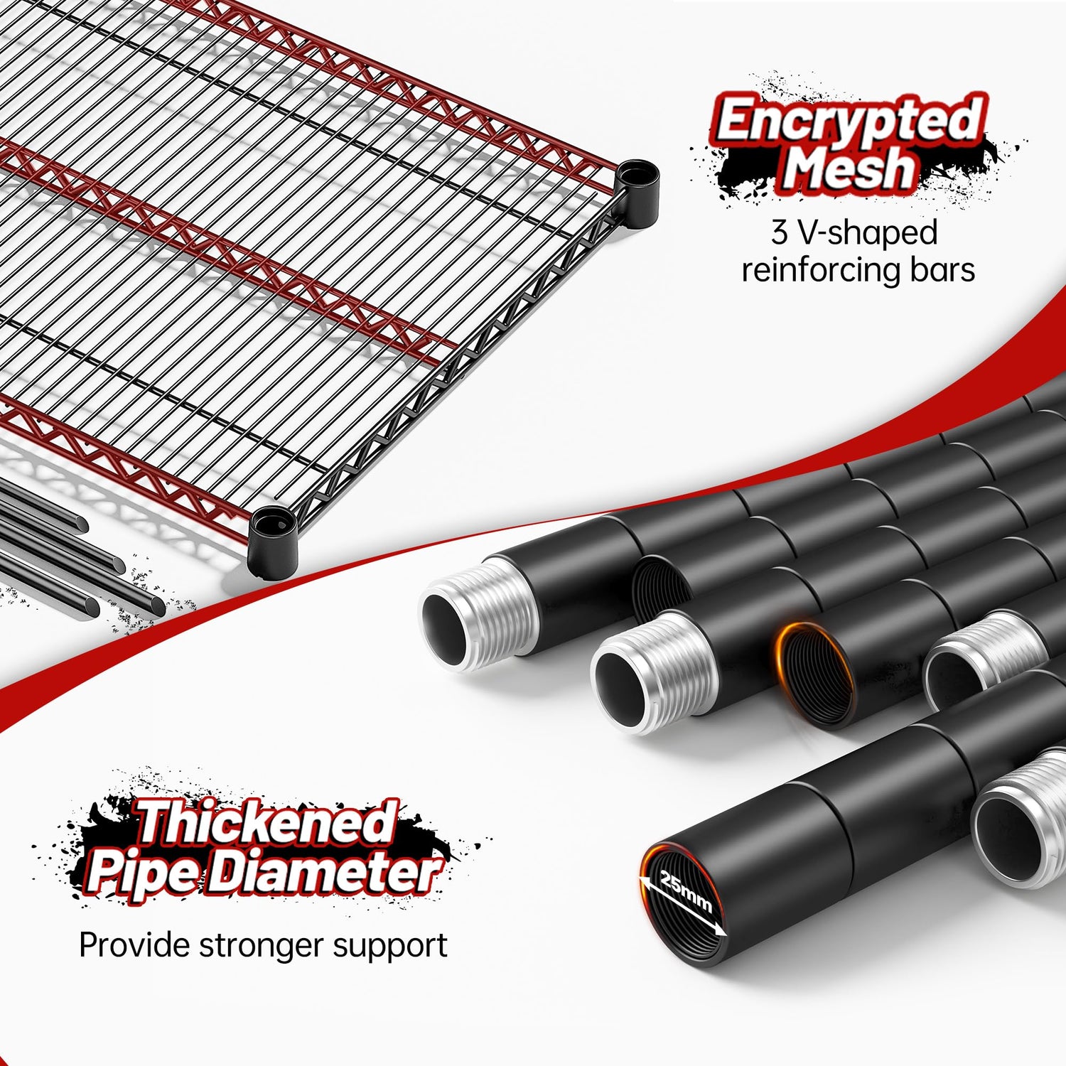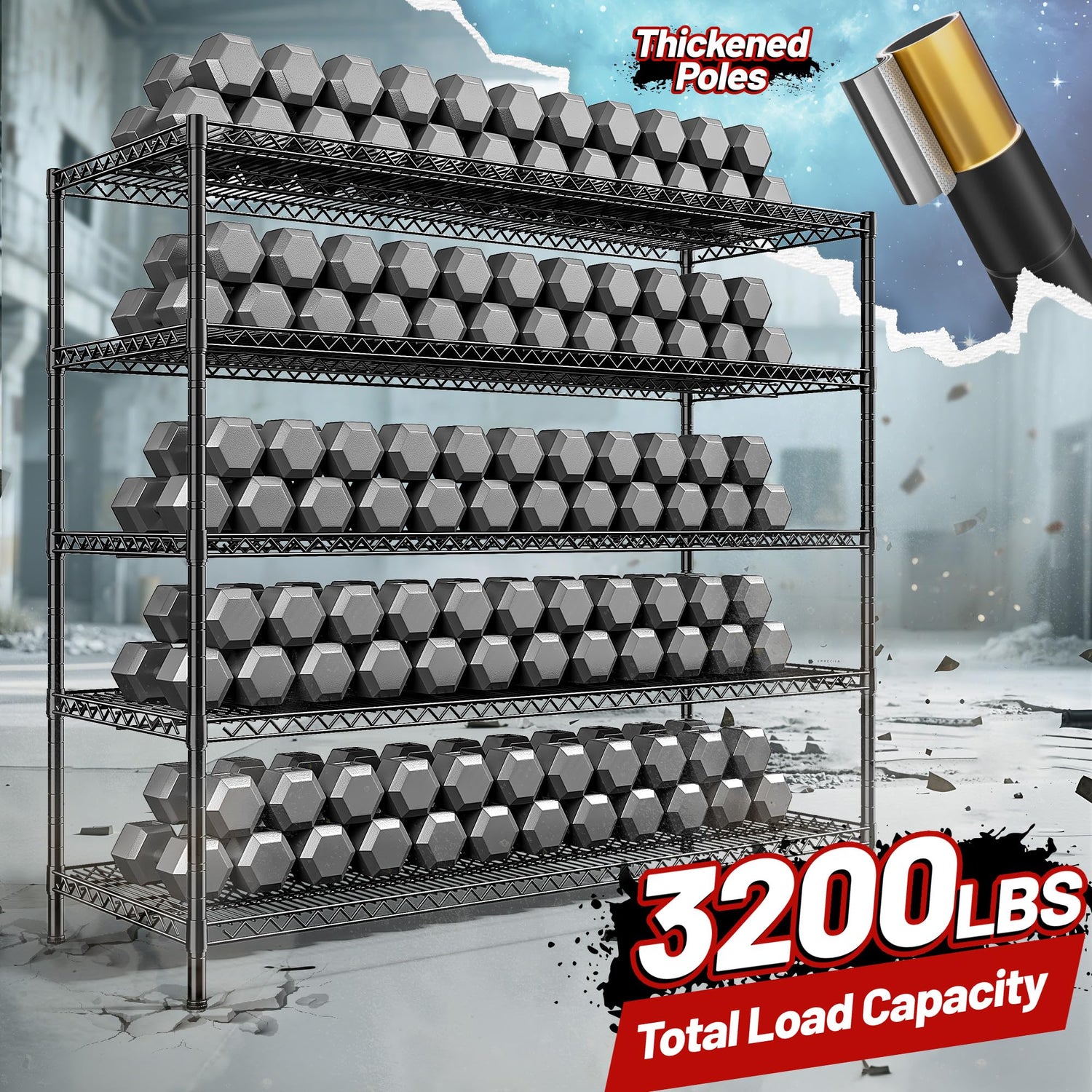 - [3200lbs Capacity Heavy Duty Wire Shelving Unit] Metal Shelving are made of sturdy heavy duty steel wire and 25.2mm diameter metal rods, with extra reinforced support bars on each Shelves of the metal, with a single tier load capacity of 640lbs and a total load capacity of 3200lbs.