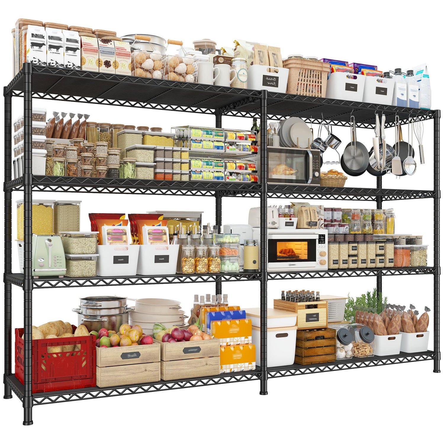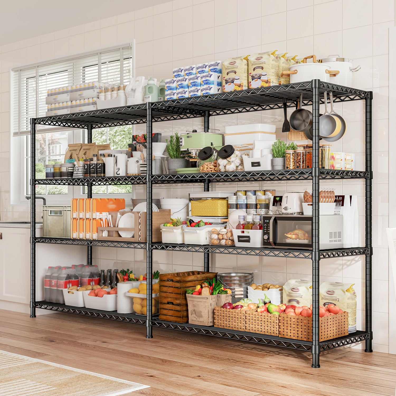 - 【72.8''W Wider Wire Shelving Unit】The size of wire shelf rack is 59"H X 72.8"W X 17.7"D, offers generous capacity for both home and industrial use. The storage capacity of the wire shelving is 3-4 times that of the ordinary shelf, offering you an enormous space for storage that can be used to store a large number of bottles, canned food, boxes, books, tools, kitchen appliances, etc