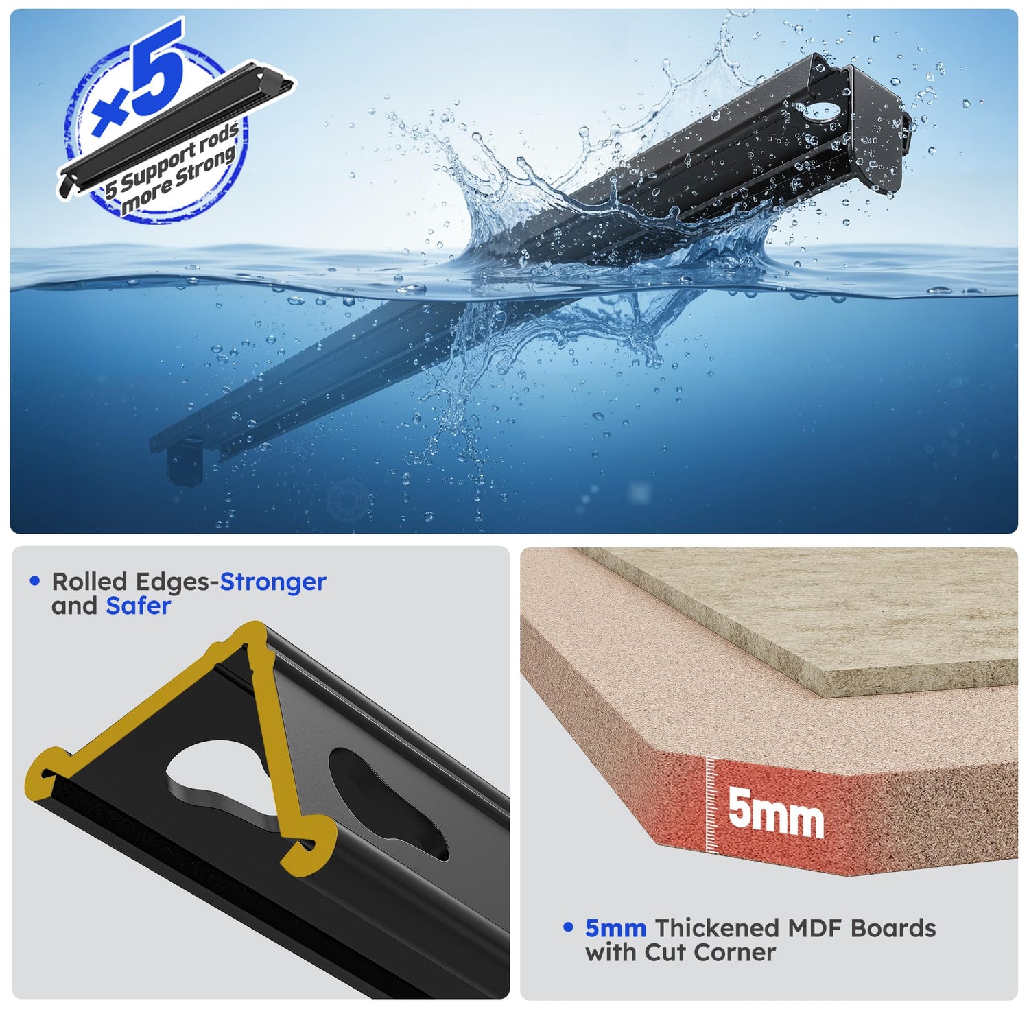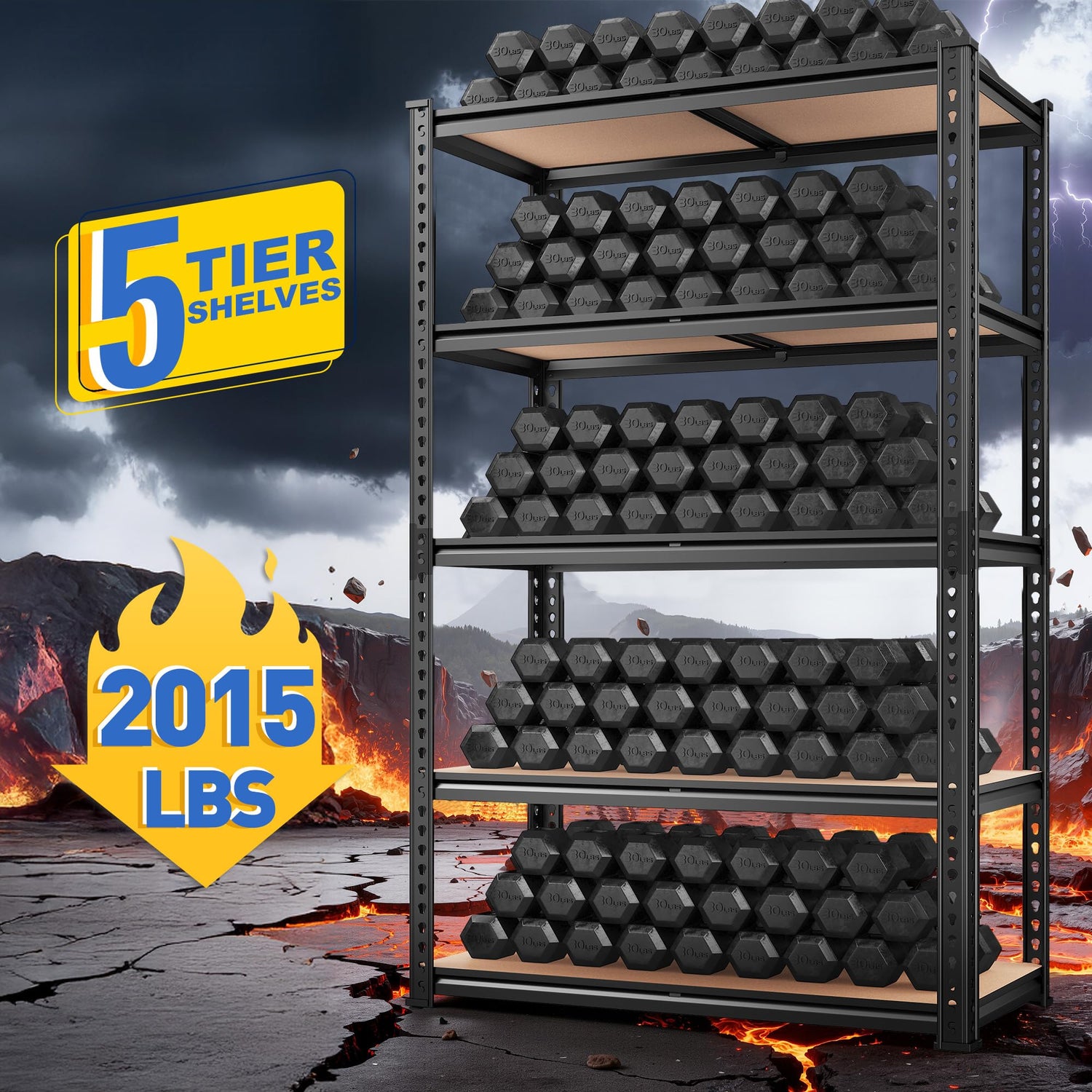 - 【2015LBS heavy duty shelving】 This is a set of two heavy-duty shelves. Each shelving unit features a rolled edge design, equipped with thickened boards and five support rods, with a total load-bearing capacity of 2015LBS. The sturdy design enables the garage shelves to bear sufficient weight without shaking, easily holding power tools in the garage, or bulk items in the warehouse, meeting the daily heavy-duty usage requirements