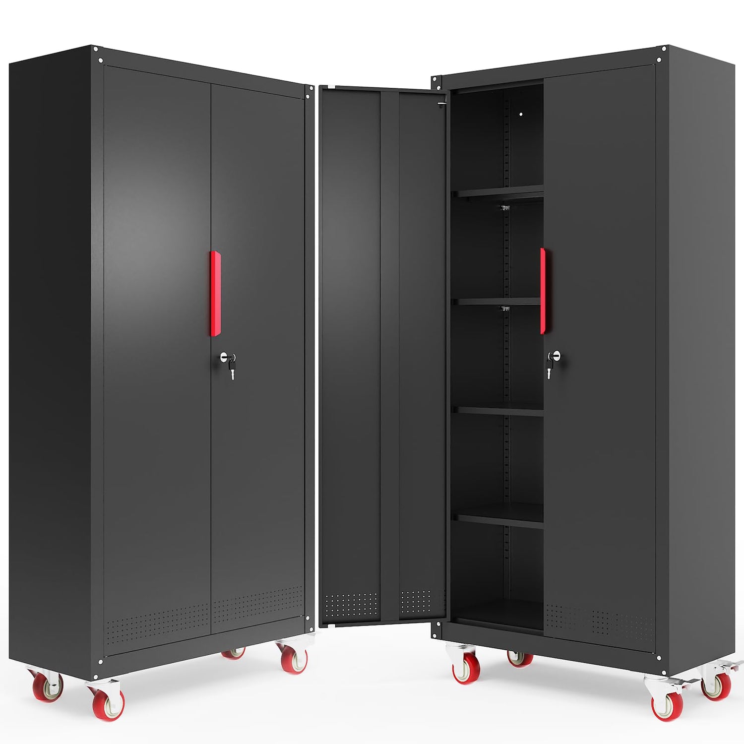 - 【Adjustable Storage Space】Garage storage cabinet with wheels measures 15.41“D x 31.52”W x 71"H. The locking cabinet is equipped with 4 adjustable shelves that can be freely adjusted in height or removed depending on the size of the items. It truly provides a flexible storage solution for your garage cabinet and storage system.