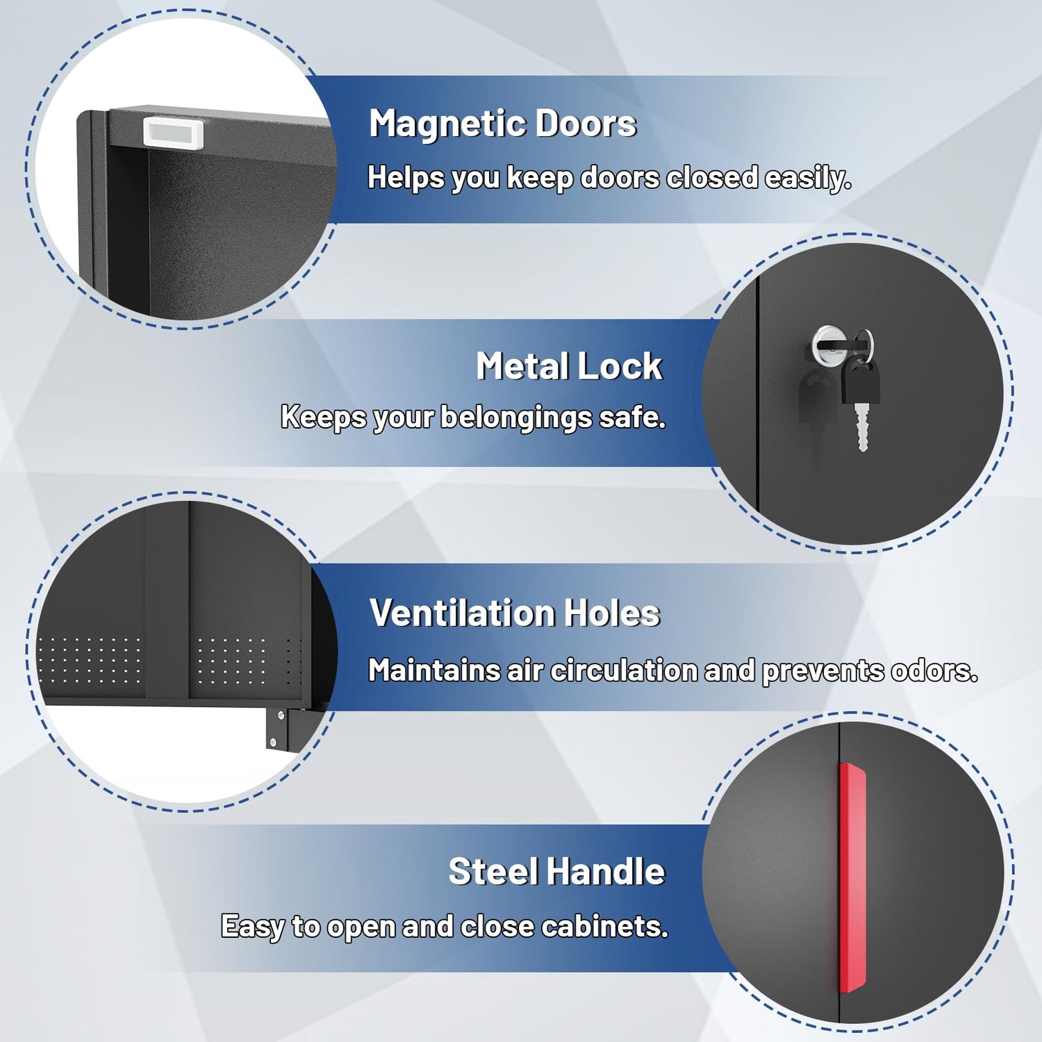 - 【Lock and Practical Design】Locable cabinet is equipped with a three-point metal lock system and two keys to enhance security and ensure that your valuables are properly protected. The steel handle and magnetic door design ensure that you can easily open or close the garage cabinet. The ventilation hole design is more practical, preventing stuffiness and odors inside the metal cabinets with doors and shelves.