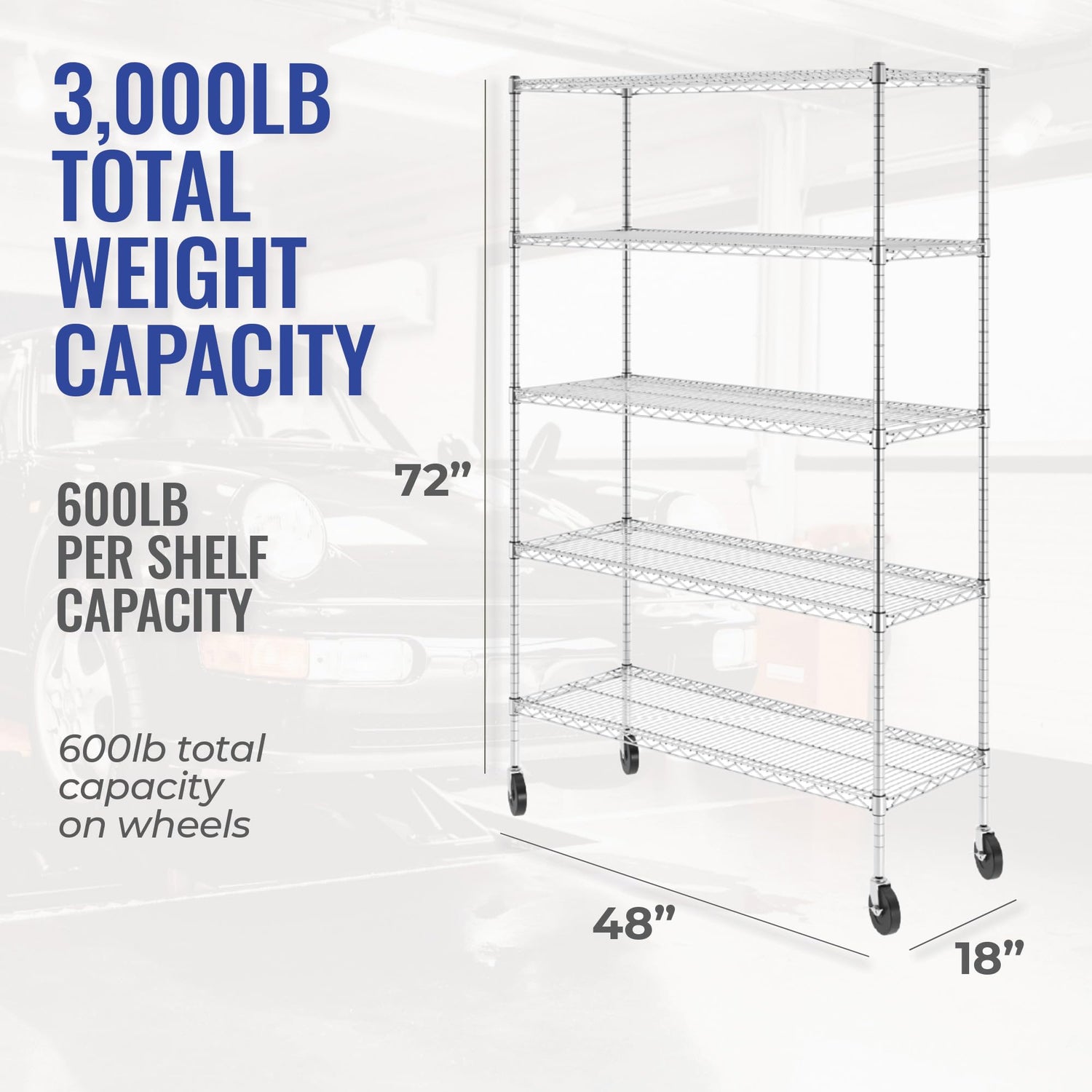 - LARGE STORAGE RACK SHELF: Being 48" wide by 18" deep by 72" high (76" with wheels) and having 5 levels of metal shelves, our storage shelves give you ample storage space. Its open sides let you quickly access your items. With adjustable wire shelves, you can solve your shelving unit problems and eliminate clutter with a clean and organized look.