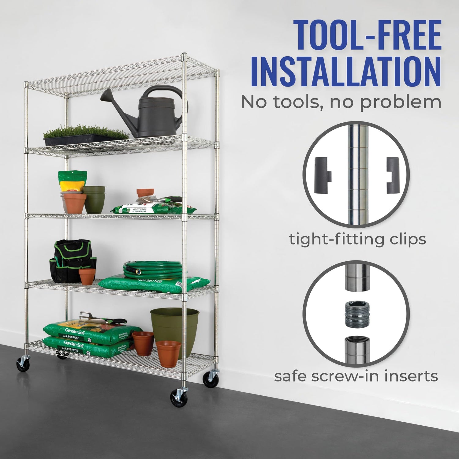 - EASY ASSEMBLY: Our wire shelving comes with step-by-step assembly and adjustment instructions. Adjust shelf height by sliding the shelves atop the clips that secure them in place. For your safety, make sure the shelves and plastic sleeves are positioned so that shelf completely fits over and covers the plastic sleeves and the SafeRacks logo is upright.