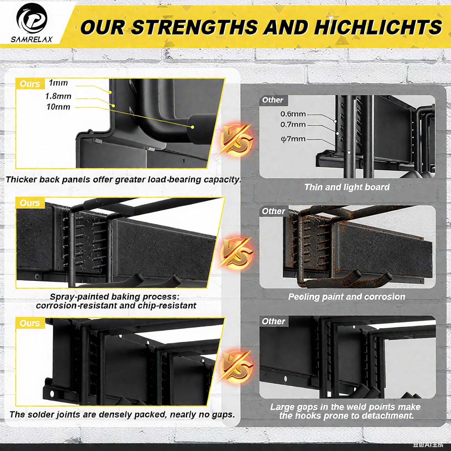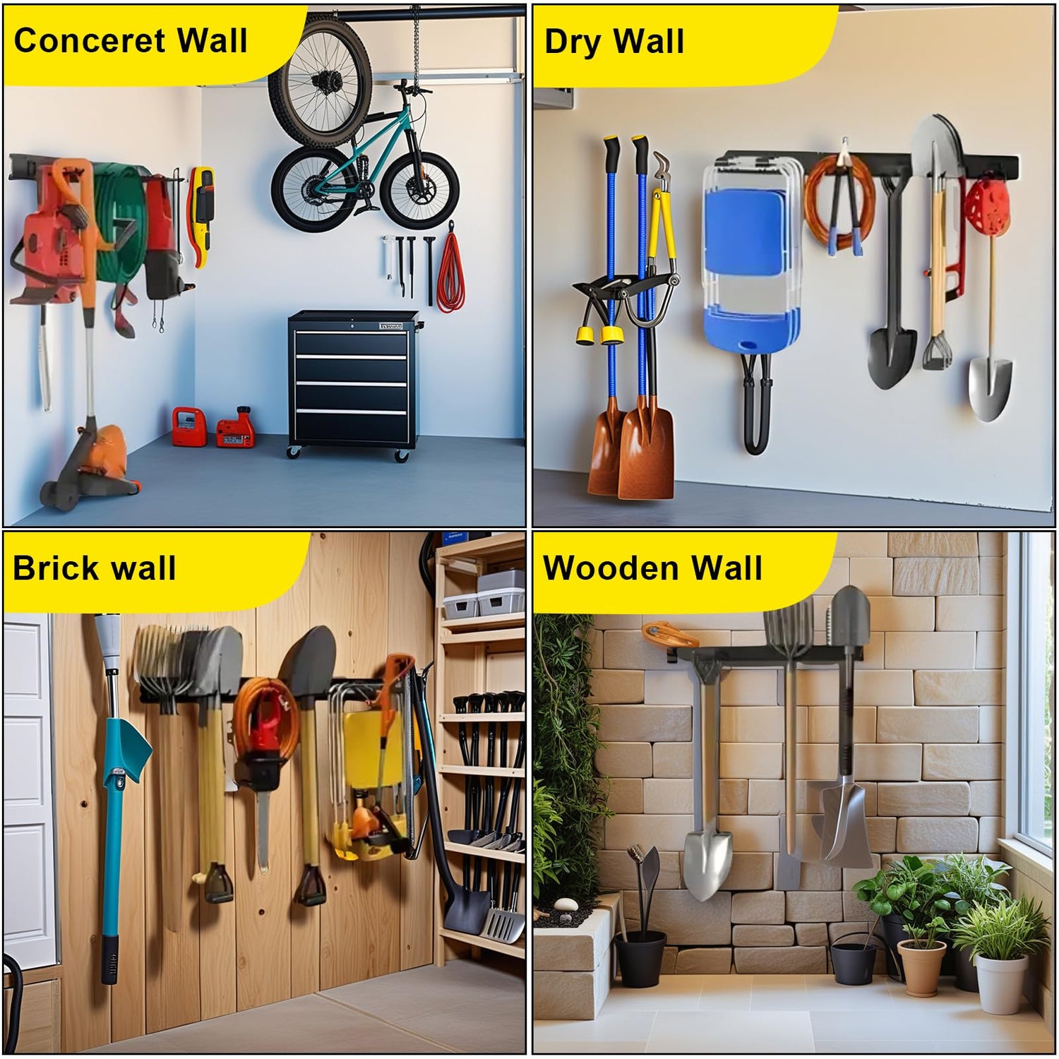 - 【Multifunctional】 Garage racks for storage can be installed in garages to hang garden tools and folding chairs; they can be installed in gyms to store dumbbells and yoga mats; they can be installed in repair rooms to hang wrenches, chainsaws, and other equipment; they can be installed on balconies or in bedrooms to hang everyday cleaning tools.