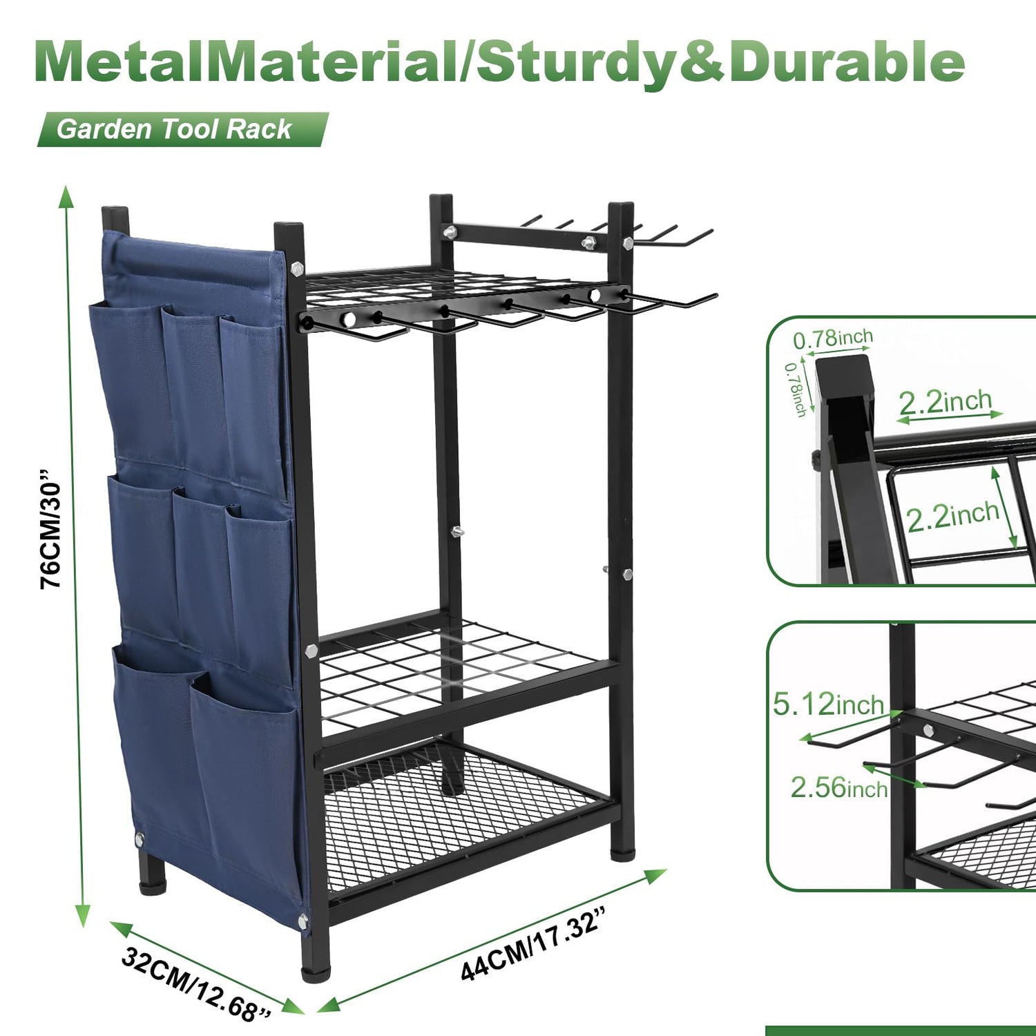 - 【Multi-functional Layout】 The design of the tool rack fully considers the characteristics and usage requirements of different tools. The hanging rod can hang long-handled tools for easy access and storage; the storage bag on the side can hold small tools and accessories, such as gloves, seed bags, etc.; the shelf at the bottom can hold some larger or heavier items, such as watering cans, fertilizer bags, etc.