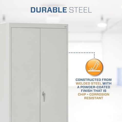Details: Turn any cluttered room in your home into an organized space with the Sandusky Lee Combination Storage Cabinet. This combination garage storage and wardrobe cabinet offers an easy and efficient way to store and organize a variety of items in your garage, warehouse, office, classroom, laundry room, or other room in your home, keeping your belongings neat and protected. It features three fully adjustable shelves on 2" centers, a full-width top shelf, raised bottom shelf, and garment rod that allows you to hang store your coats, jackets, suits, dresses, and other clothing pieces. There's no need to worry about theft or unauthorized use thanks to the convenient 3-point door lock system which comes complete with two keys. Constructed from durable welded steel with a powder-coat finish, this Greenguard Gold Certified garage cabinet withstands years of quality organization. The lockable utility cabinet measures 24"D x 36"W x 72"H to offer plenty of room for your clothes and valuables without taking up too much space.
