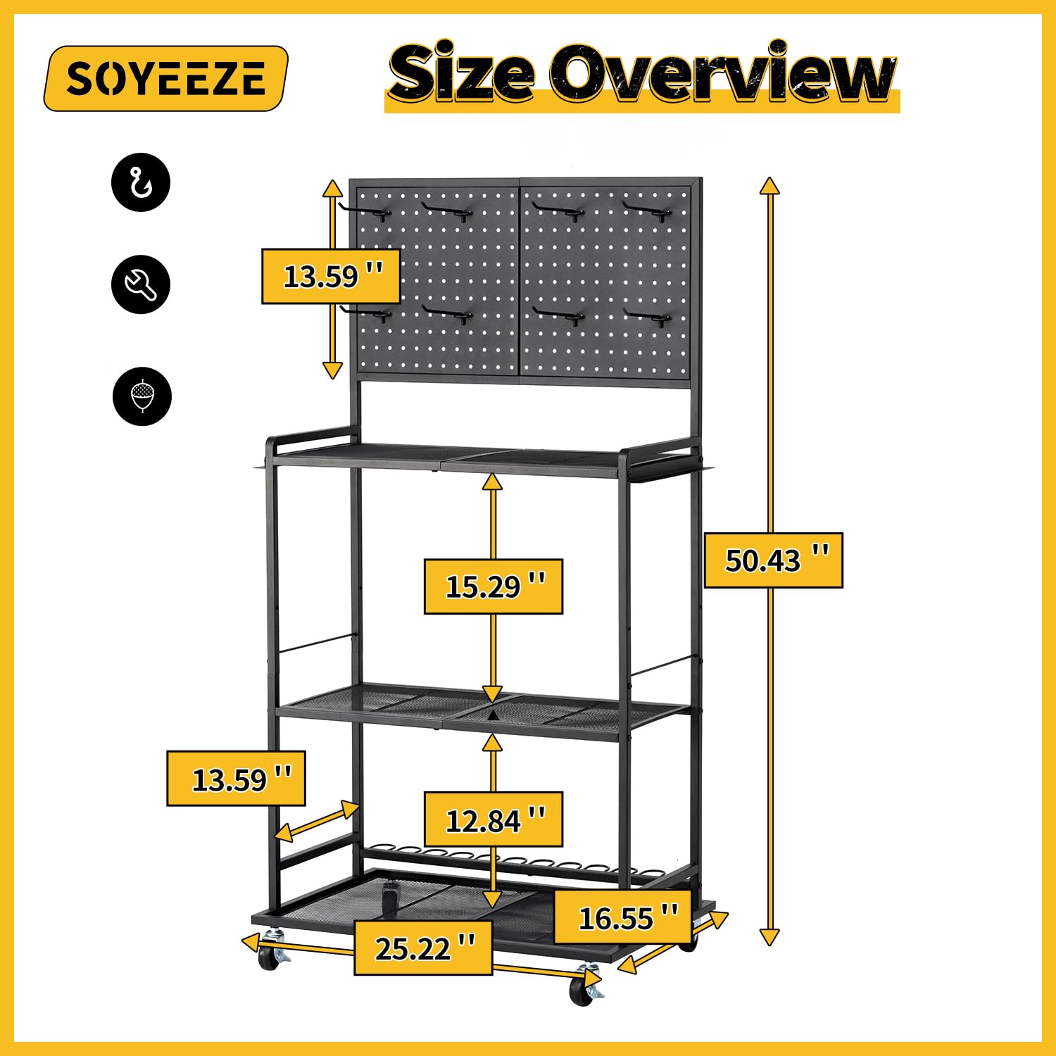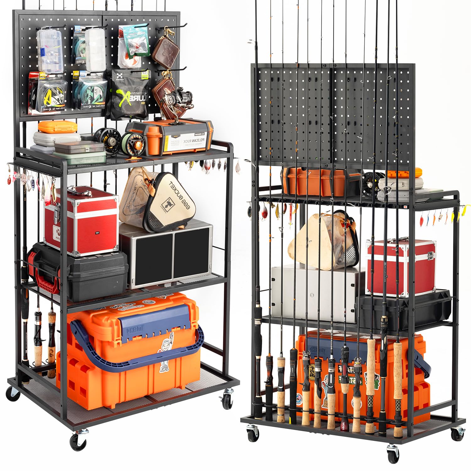 SOYEEZE Large Size Fishing Rod Holders for Garage, 3-Tier Fishing Pole Rack with Pegboard and Hooks, Fishing Gear Tackle Box Organizer Up to 12 Rods, Rolling Fishing Storage Cart with Lockable Wheels