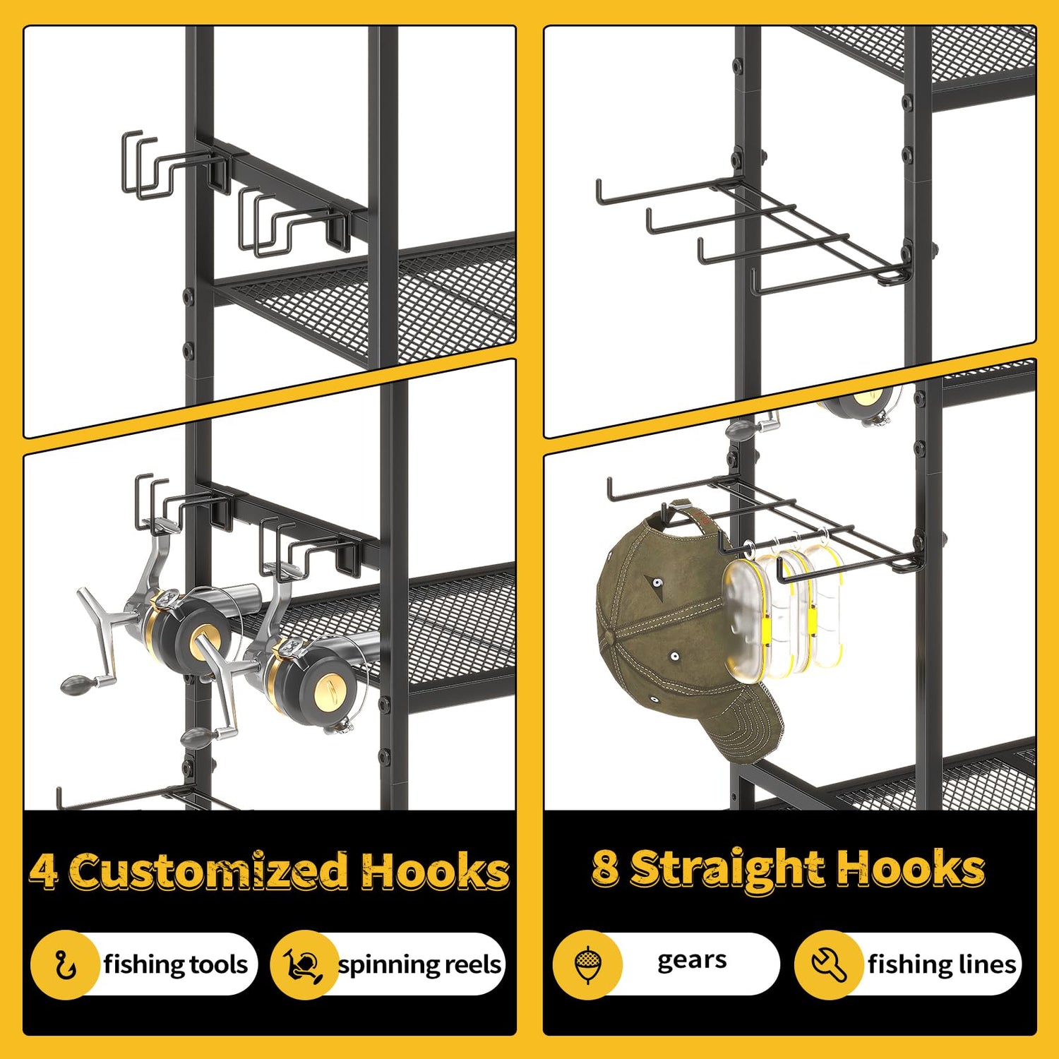 - 【 Smart Side-Mounted Organizers】-Maximize efficiency with our 3-tier side organizers designed by anglers, for anglers. The vertical fishing rod holders for garage of top-mounted hooks keep your favorite lures visible and within reach. The middle reel slots securely cradle 4 spinning reels with anti-scratch padding. Bottom heavy-duty hooks neatly store multiple spools of line, leaders, and tools. Every component is strategically placed for instant access when that trophy fish strikes.